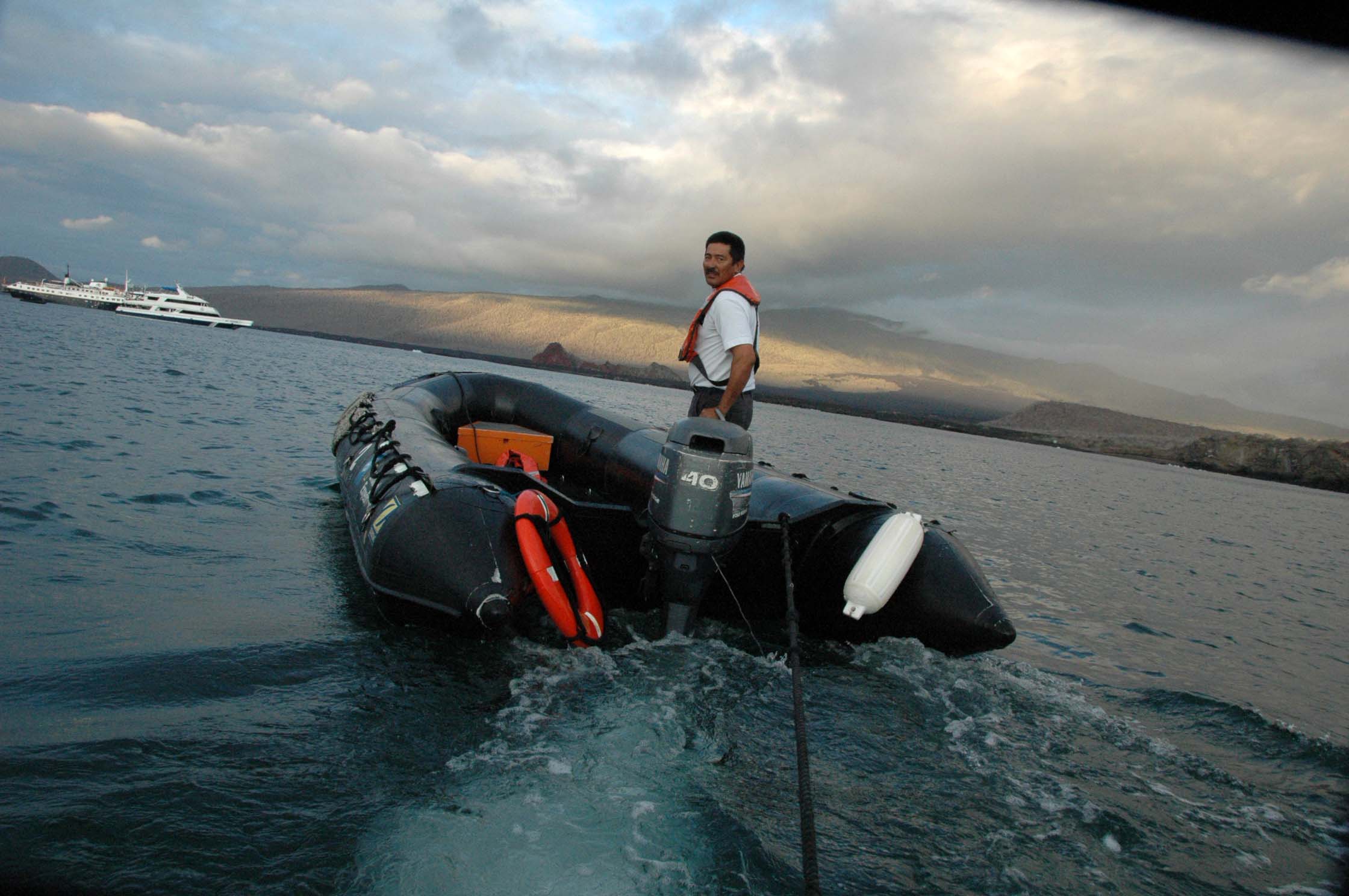 they called a second zodiac which towed us out to the boat. Half-way there, the current was too strong for a tow, so they brought over two more zodiacs and we did a mid-water switch. They put them side by side and you slide your tuch over to the other zodiac. Very easy and very safe, but an adventure none the less.
