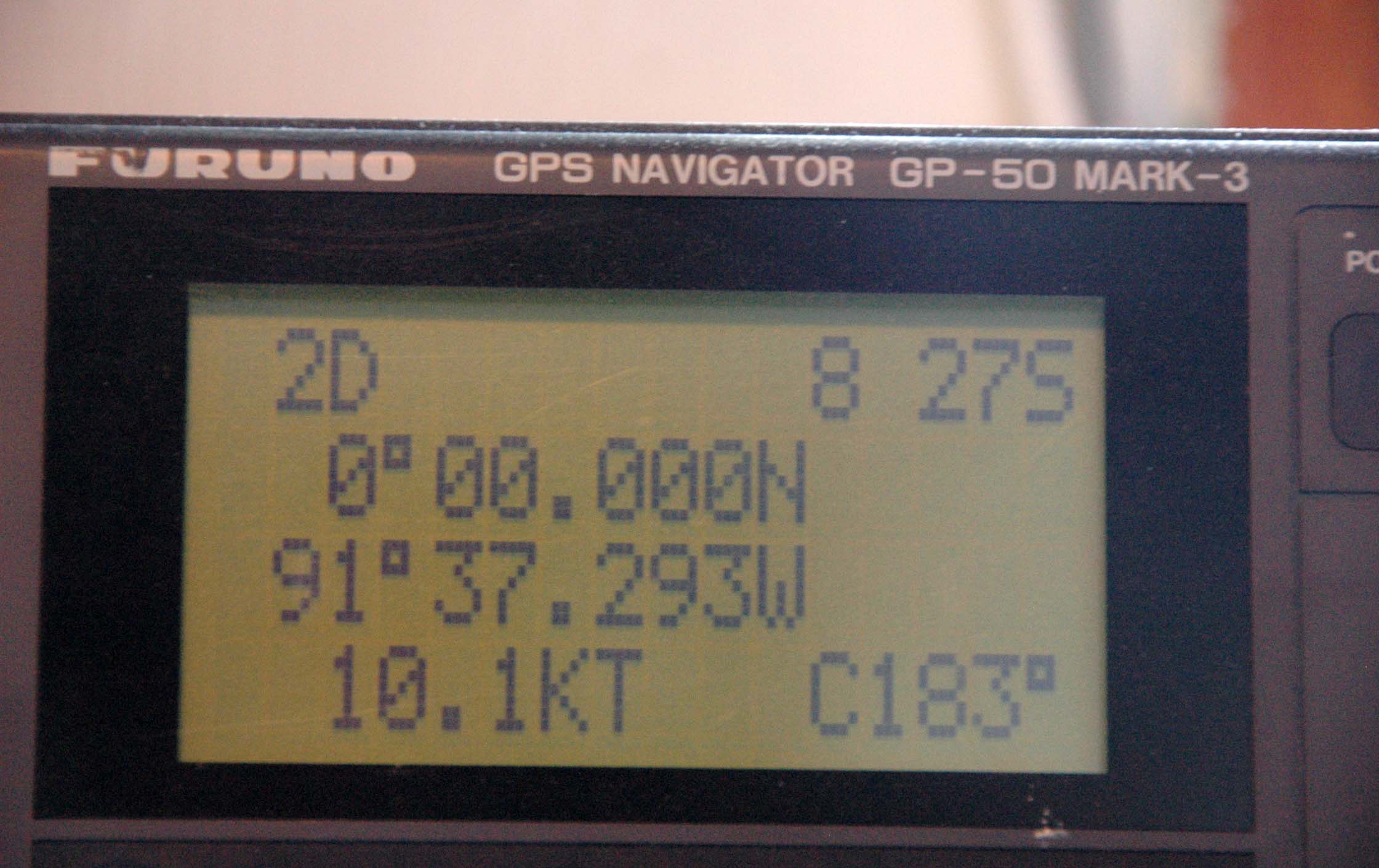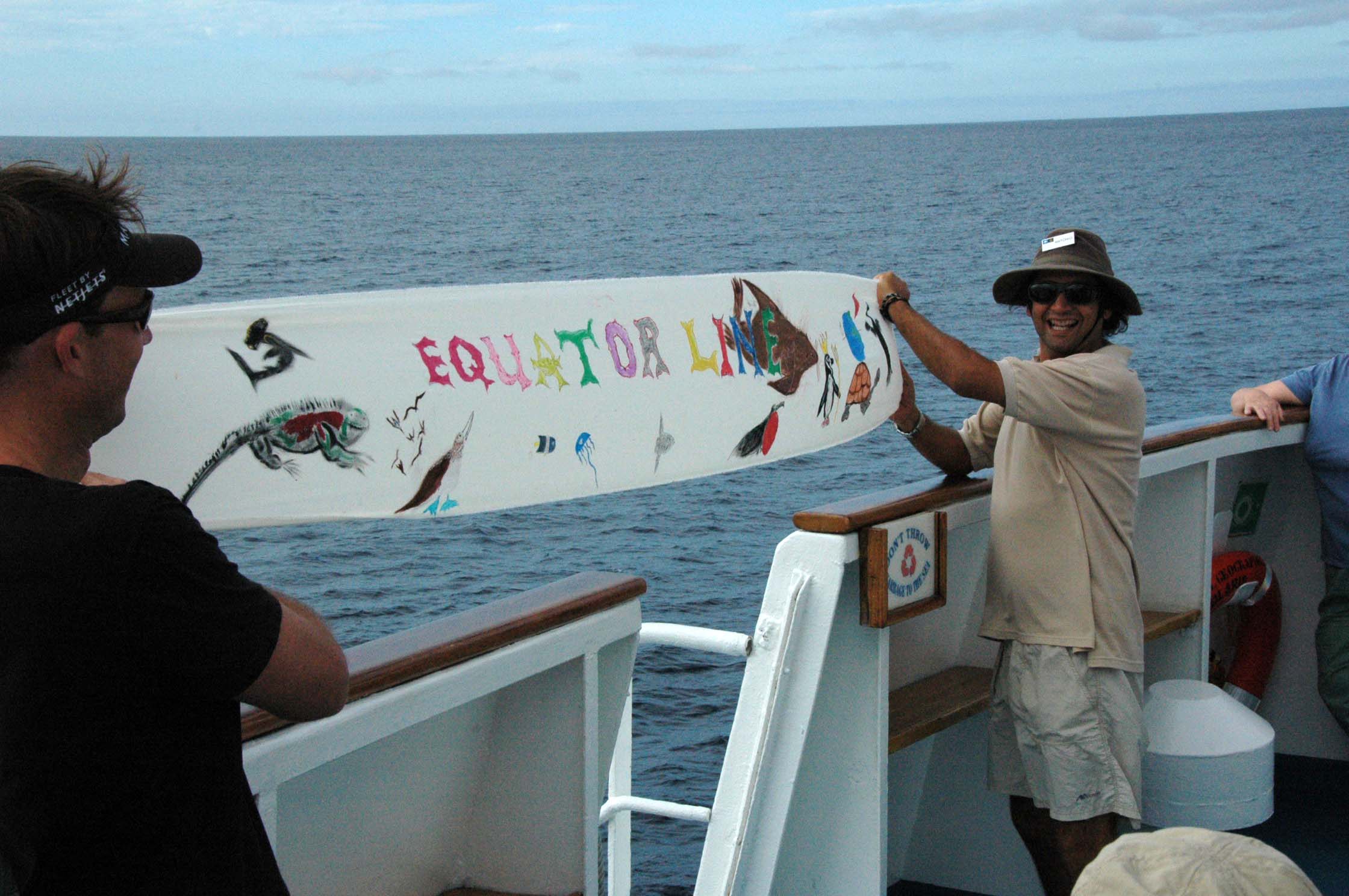 They tell us today is Tuesday. At 4:30 in the morning we crossed the equator. We did not wake up for it. We did however wake up especially early to circle the Roca Rodonda (Round Rock). This is an uplifting of the earth, a volcano which is full of bird life. We had a beautiful sun rise and saw hundreds (thousands?) of shear water birds, blue footed boobys, Nazca boobys, frigates, and others whose names I can’t remember. The birds were literally in swarms all around the water and the rock (this rock is not just a rock – it is more like a tall, small island). There were also sea lions frolicking (I did tell you – sea lions are everywhere) and dolphins arcing in and out of the water. After watching for a while, we went down for breakfast. But the real excitement came at 8:30ish when we once again crossed the equator (and this time we were all awake!). You see, we went north around Isabela Island and then came back down south on the other side of the island. I have a picture of the ship’s GPS saying we were at a latitude of 00.00.00. Very exciting. The captain thought so too as tonight when we returned to our cabins, we had a certificate announcing we had crossed the equator (in fact we will end up crossing 4 times before the trip is over).