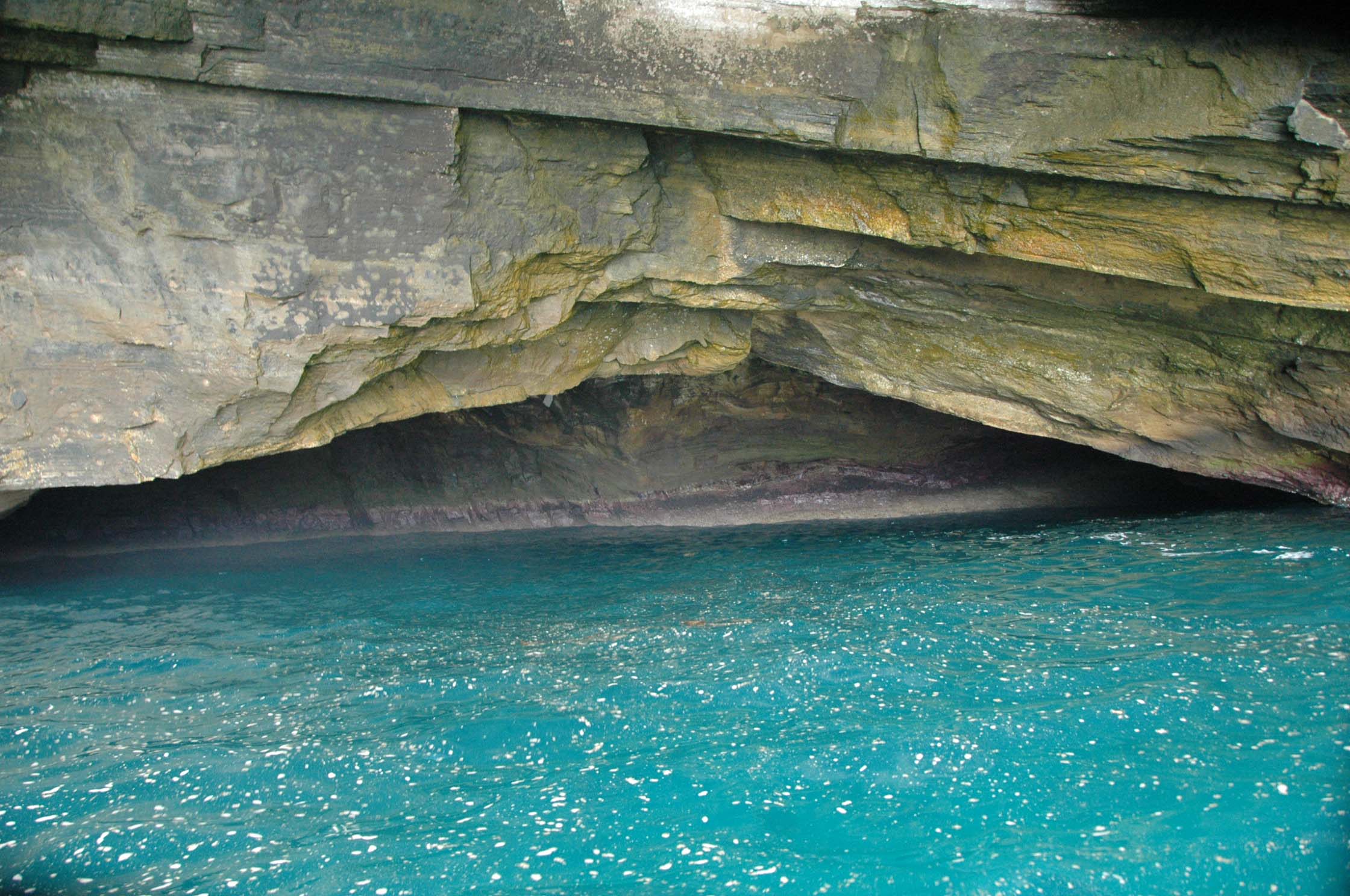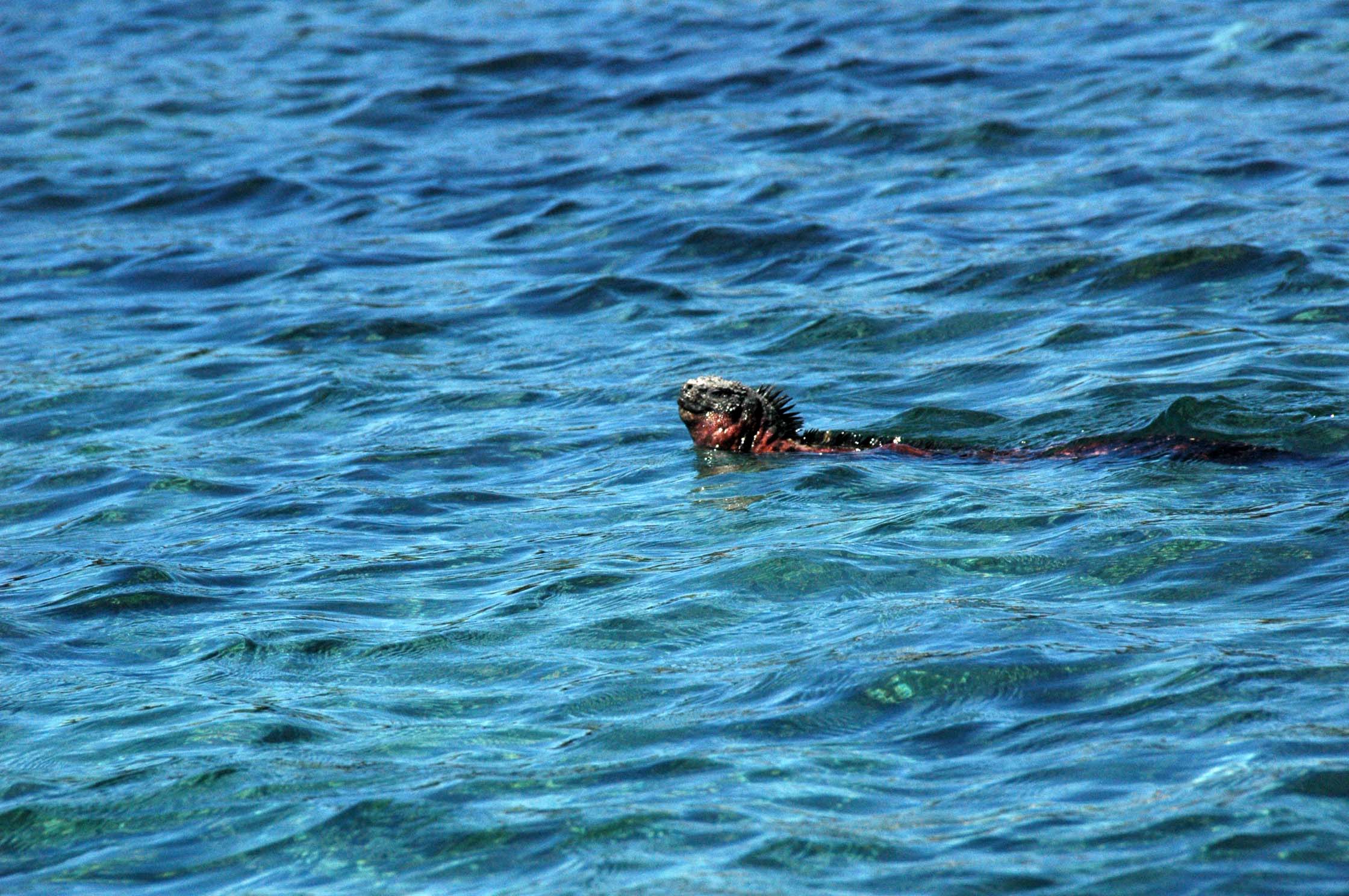 After the excitement of crossing the equator we all headed for a zodiac cruise at Punta Vicente Roca, part of Isabela Island. This is a shear drop of a volcanic wall, with ribbons of black lava and caves, that is quite spectacular. We went looking for marine mammals such as PENGUINS. Yes, we did get to see some Galapagos penguins, which of course made me very happy. It is not often you get to see a penguin and an iguana share a volcanic ledge. Now you might ask – isn’t it too hot at the equator for penguins? (Go ahead – ask). Well, since you asked, I’ll tell you. The water around the equator is quite frigid due to the deep Cromwell Current, also known as the Equatorial Countercurrent, which rises up along the western edge of the undersea Galapagos platform. This is responsible for much thick sea fog and cooler sea temperatures. So, some penguins can live here. We also saw more – yes you guessed it – sea lions. And we finally got to see turtles – all over the place. These are big turtles, around 2 feel long, swimming through the water. What you mostly see is the top of their shells and their heads sticking up out of the water when they come up for air.