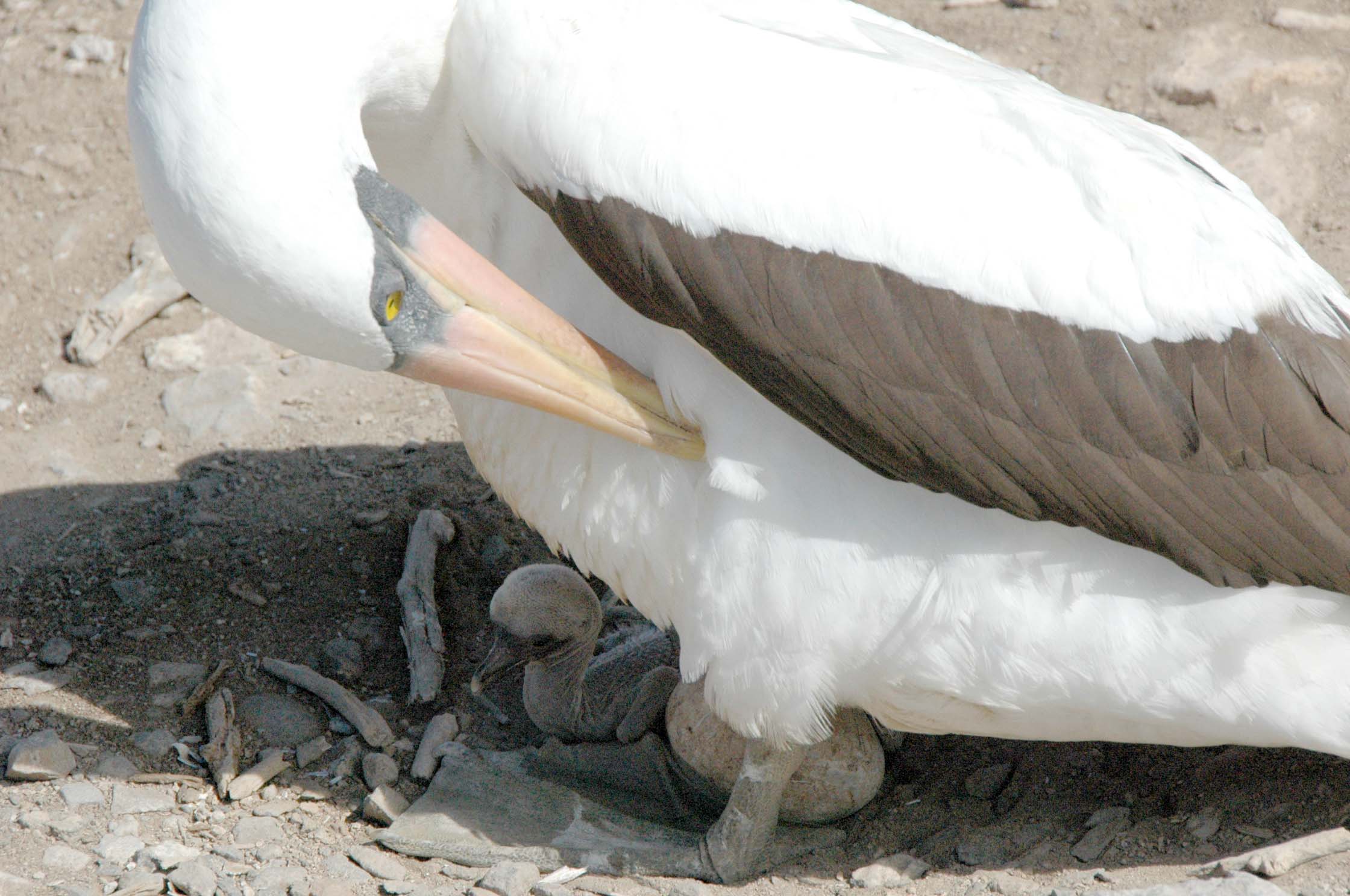 January 13 (I think it is Sunday – the sign of a good vacation – we have lost track of the date). Today we were on Espanola Island. The morning started with a long 2.5 hour hike around the island where we saw more blue footed boobys, Nazca boobies, marine iguanas (these were red and green, also called Christmas iguanas), Galapagos hawks, sea lions and lots of baby boobys (both blue footed and Nazca). The male boobys sit on the eggs. We also saw blue footed boobys courting. The male whistles and struts with his feathers opened up, around and around the female booby, who calls out more like a honk.