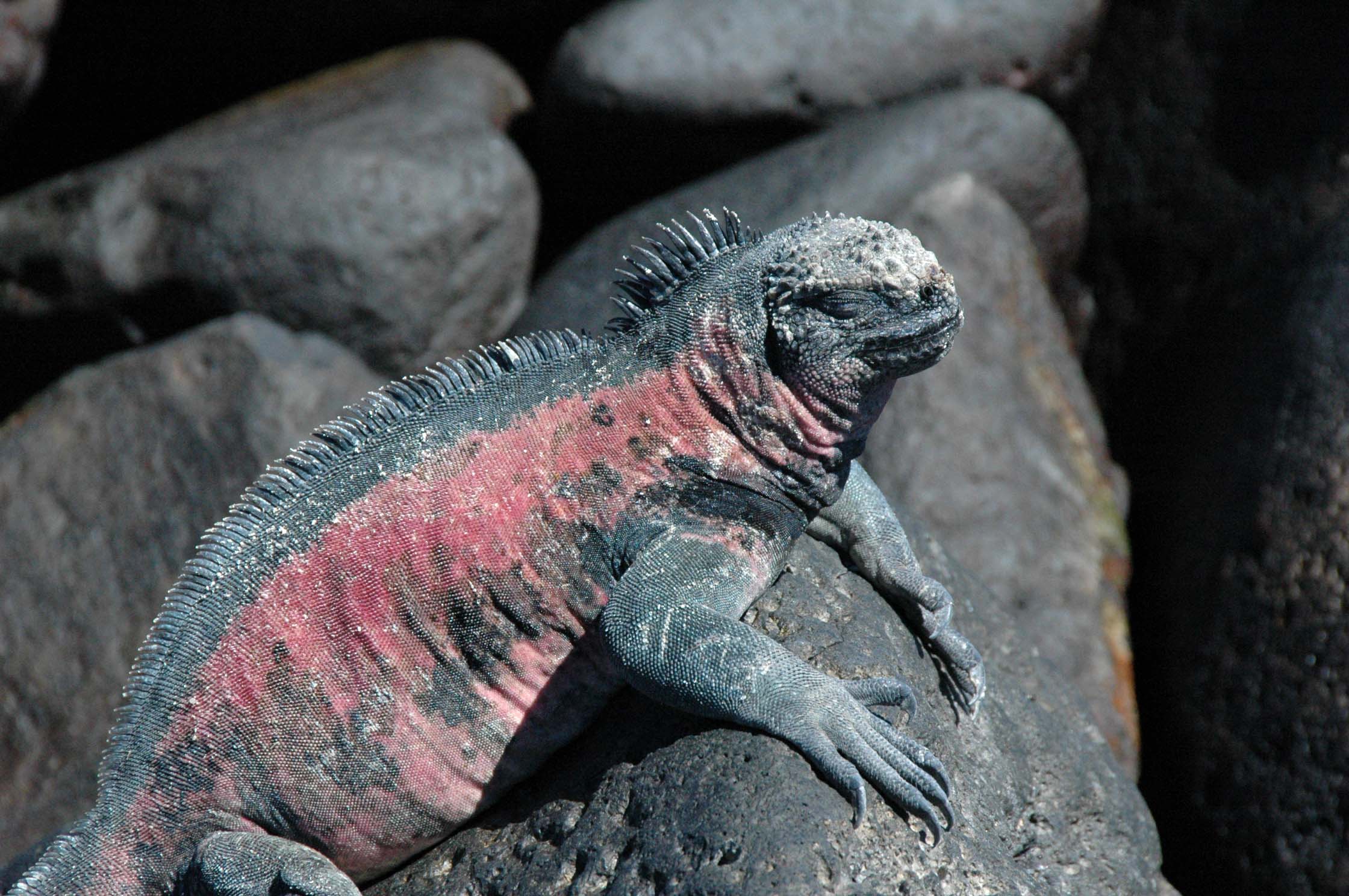 After a hot shower and lunch, it was back out again, this time to Fernandina Island. Fernandina is an imposing volcano rising to almost 5000 feet in elevation. It is streaked with fresh lava flows most of which are black and lifeless. But our landing site was at Punta Espinosa which reflects the abundant life supported by the rich sea bathing the stark coastline. We saw hundreds of marine iguanas basking on the dark lava, sea lions, flightless cormorants, and sea lions (a bachelor colony, i.e., all male. Each male sea lion has 5-6 females in its pod. Since the ratio of male to female sea lions is 1:1, there means there are some male sea lions that have no females. They end up on bachelor island. These are the males that didn’t win the alpha-male battle). The ground was essentially slabs of ropey black lava with iguanas blending right in. We stayed until almost sunset as the sun began to sink into the water reflecting in the tide pools.