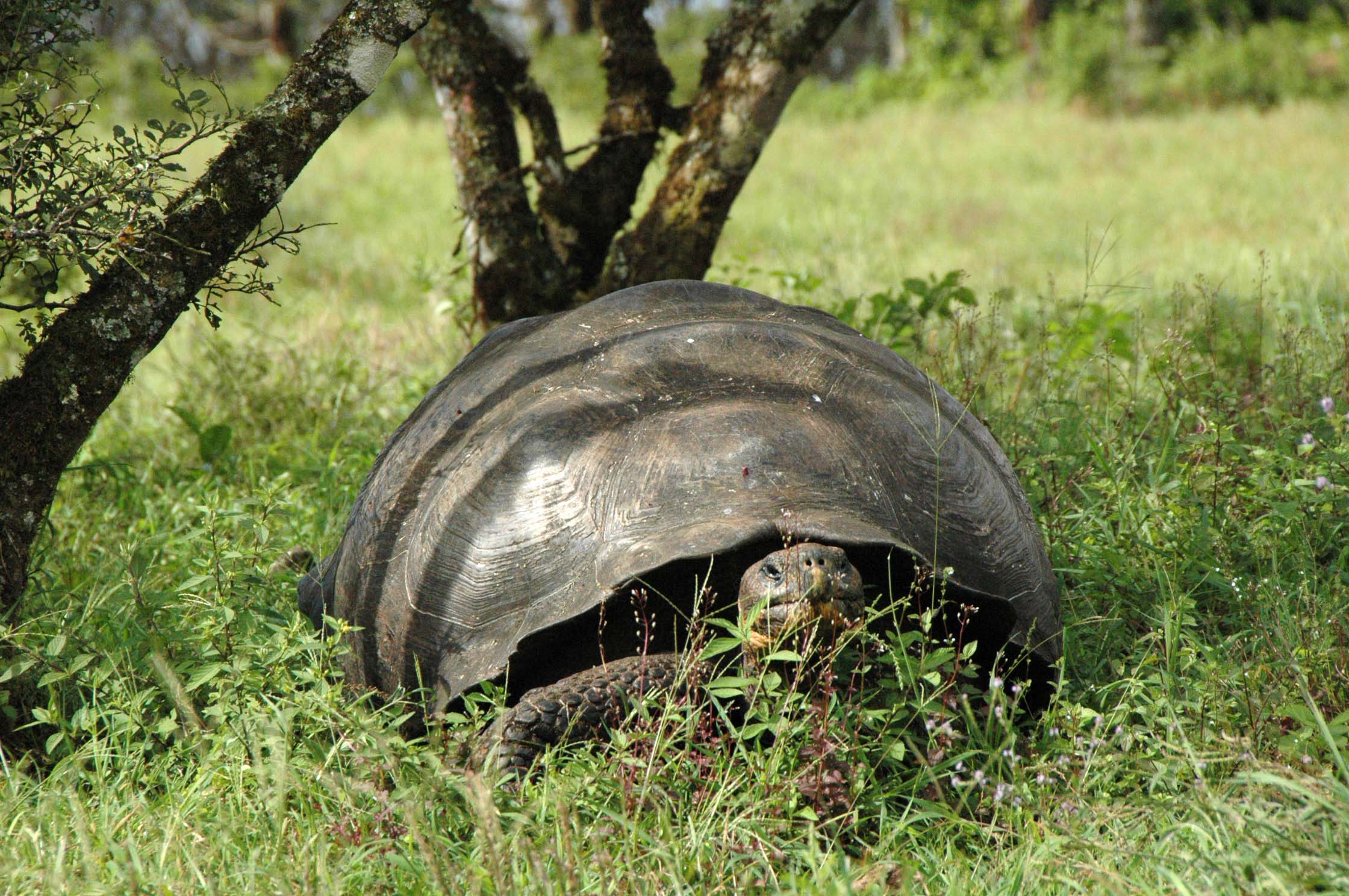 But the real fun began when we were taken, still in the highlands, to the property of a Galapagos native whose land is in the middle of the tortoise migratory route (Rancho Miraposa). What this means is that his land is covered with “wild” tortoises. We were given free time to wander alone amongst these giant, gentle beasts. It was magical. Andy and I just sat on the ground and watched them – close up and personal – for 10-15 minutes. We watched them eat, drink, breathe (they can get quite loud). And the whole while of course, we took pictures (I shot close to 400 today and Andy another 85). There were enough of them and the field large enough that everyone could have his/her own tortoise to spend time with without having to share with anyone else. To see animals in their own habitat in the wild really makes one understand the force of nature and the magic of life.