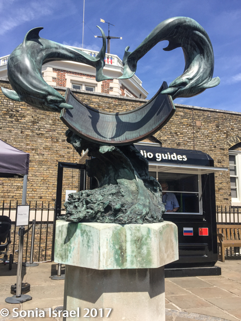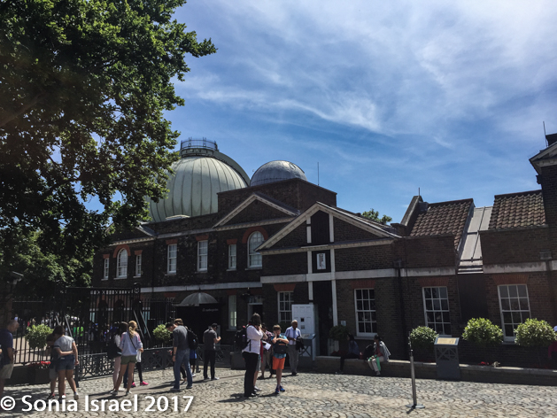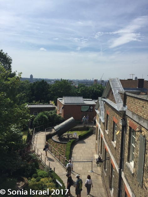 About halfway through my self-guided tour, I heard an announcement that they would be a official tour at 1:30. I decided to skip the rest of the Flamsteed House and head outside to join the tour. Why not learn as much as I could? When I got outside I looked up and saw that the Big red ball had indeed come down. I met our guide Sally, and ask her about the ball. Her response was that it got stuck today and someone had to come fiddle with it to get it to go down. That should give me a lot of confidence about how accurate the world clock is! Today, as I write this, the notice on the webpage announces that the ball is out of order due to weather.