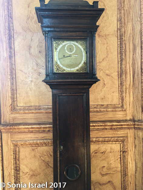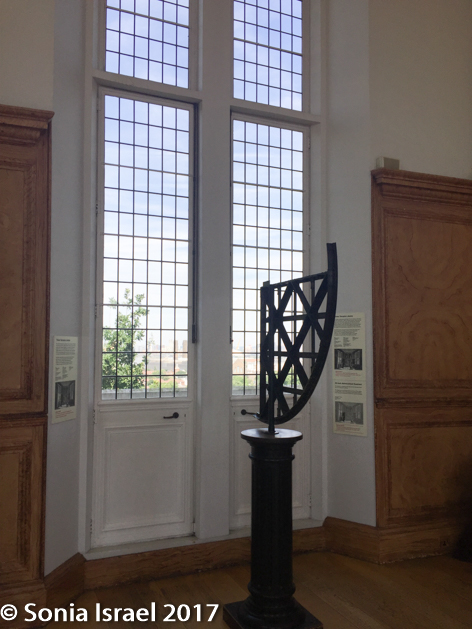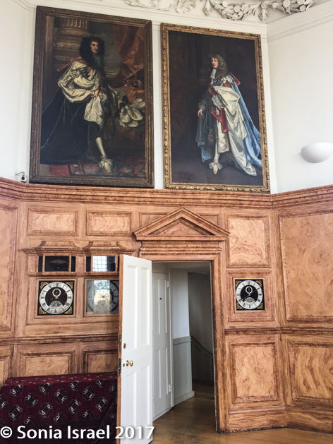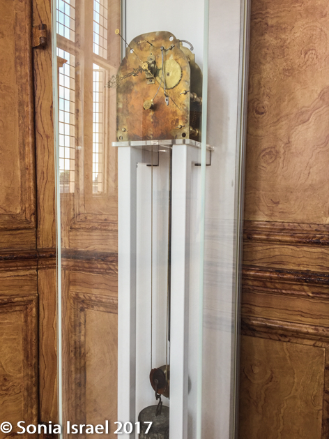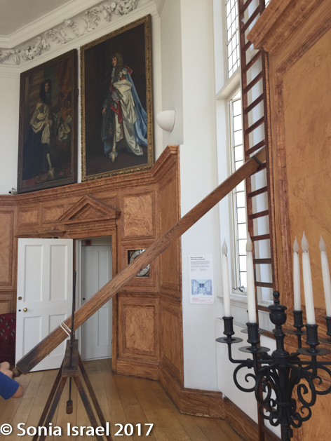 The room was designed so that the Astronomer Royal, in this case Flamsteed, could observe celestial events in the night sky. And that is why it has these beautiful large windows. But, in order to save money, King Charles II had the house built on some standing foundations and none of the walls, and thus none of the windows, were aligned with the meridian. So Flamsteed couldn’t measure the position or the movement of the stars. Rather, he built a hut nearby from where he made all his measurements. By the way, the beautiful wood paneling all around the room is actually painted plaster – another way King Charles II saved money.