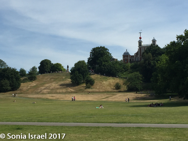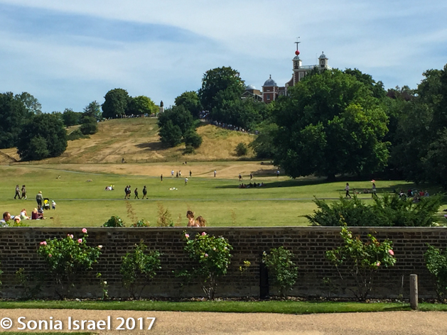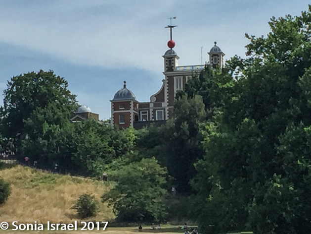 There was a map at the bottom of the station stairs, but I still couldn’t figure it out. So I went next door to the Novotel hotel and asked the concierge there. He graciously gave me a map and showed me the way to go. It was mid-day, hot and the walk is primarily up a big hill. So I took a black taxi instead. Cars are not allowed to drive through the park, but the driver went around the park which gave me an opportunity to see the town of Greenwich.