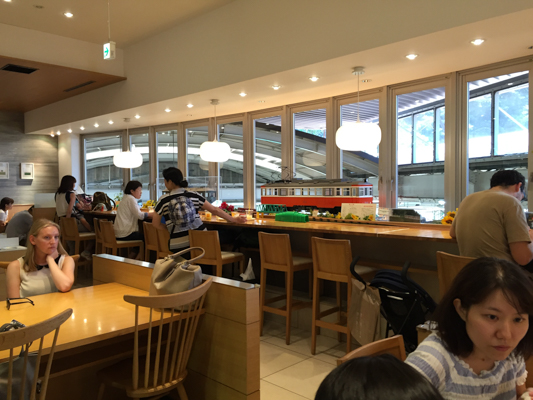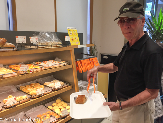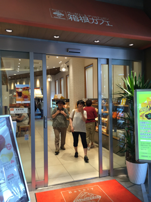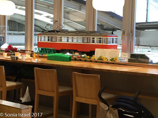 We had read about a famous café for pastries in the train station, The Hakone Café. It was on the second floor and there is a big red sign over the door so it was easy to find. The apple pie is the most expensive item, but that is what they are most famous for. It was described as “stuffed full of juicy chunks of fruit, and rich in taste (350 yen). Their cinnamon roll is soft inside and crunchy outside (180 yen).”  Since it is a train station, there were little (and not so little) toy trains everywhere. But they wouldn’t sell any. I had promised my grandson a purple train (or blue or red in that order), and I had yet to find one. But we shared a piece of apple cake. It was good, but not great. But it was all part of the experience.