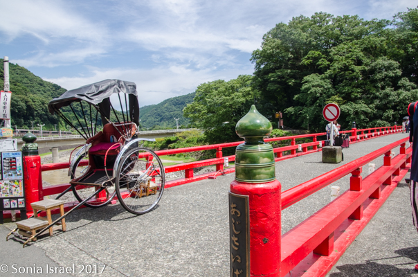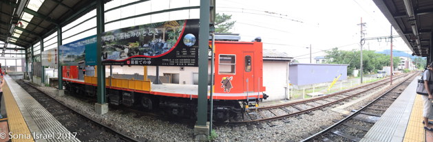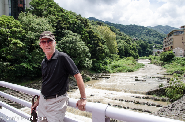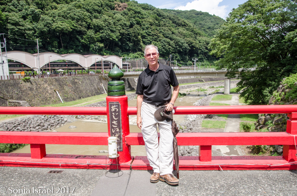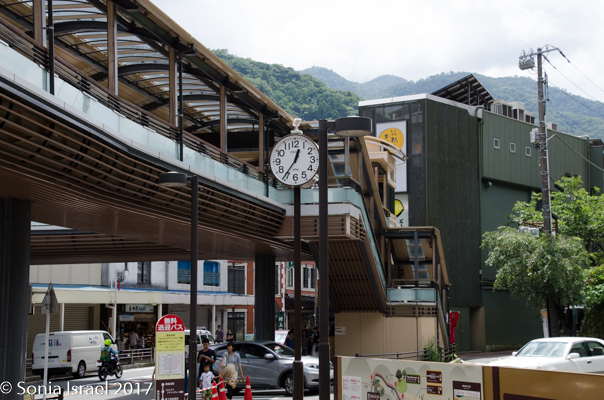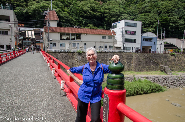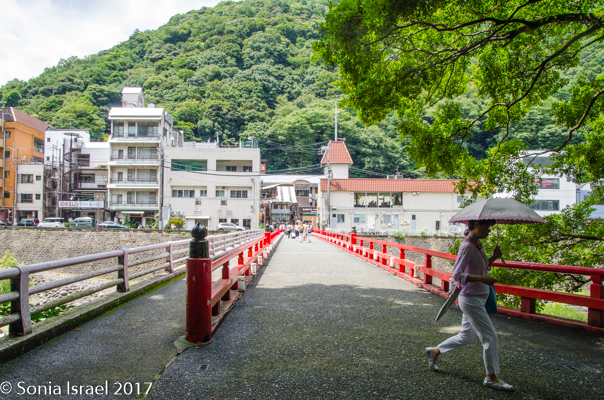 Many people come here as the starting point for all the hot springs (it is considered a “bustling hot springs town”). But we just came to walk around and have lunch.  We walked outside of the station and then up and down the main street. We did some window shopping and then found a red bridge leading into a park. We walked as far as the entance, but did not climb the steep path into the mountains.