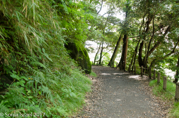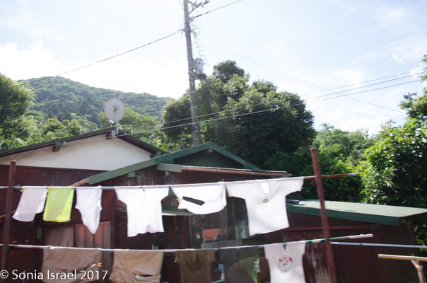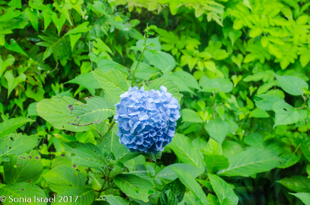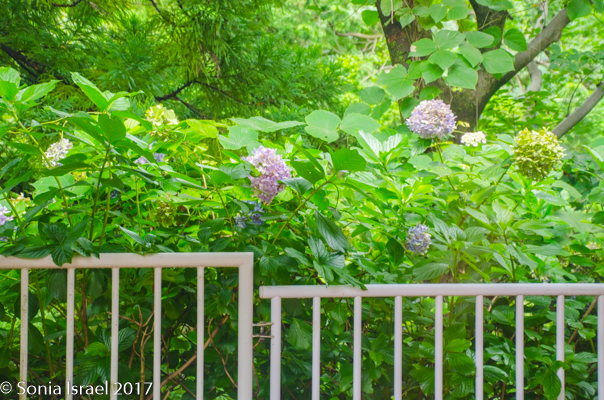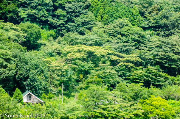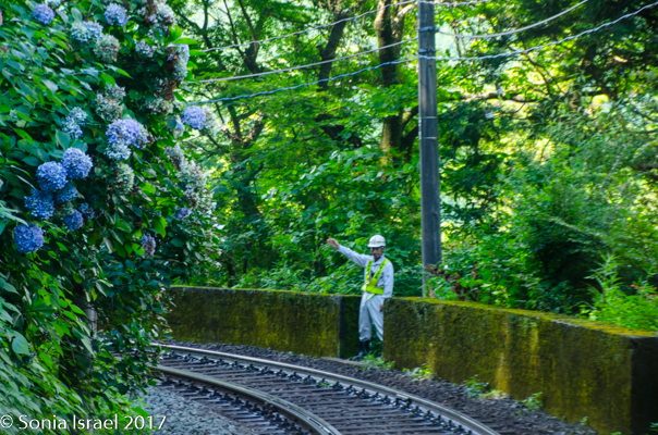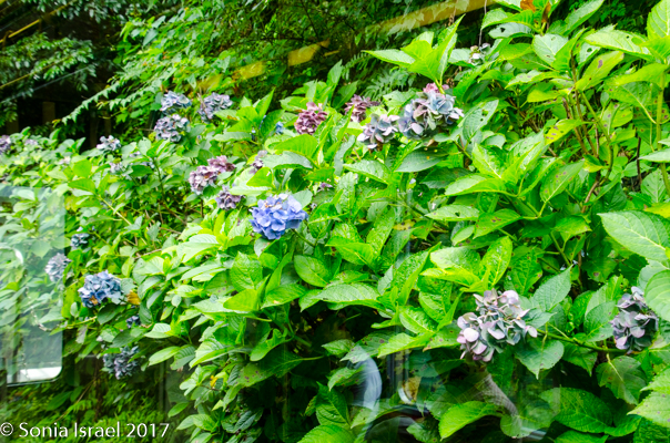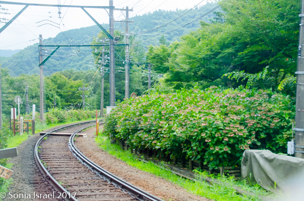 It was then time to head back to Gora. On the return, we sat in the front so we could look out and see the angle of the slopes and the elevation differences between the switchback sections. At times the train would pull off on a side track while another train passed, then reverse directions to go up an incline. In fact, the train  repeats switchbacks three times to go up the steep slopes. During the ride, we could look down into the valley of the Haya-kawa River, through the greenery, while the train chugged along. The entire journey, on both sides of the track, we were surrounded by trees and hydrangeas. The hydrangeas reach full bloom in mid-June but we could still see the remnants and some were still blooming. In fact, the train is nicknamed the “Hydrangea Train.” Due to the different altitudes and thus different temperatures along the route, as the Hakone Tozan train climbs up the mountain, the hydrangeas bloom from the lower end up with the final blossoms at the top at the end of July. The hydrangeas grow very close to the railway and we could almost touch them from the window.