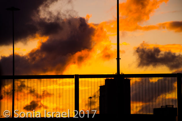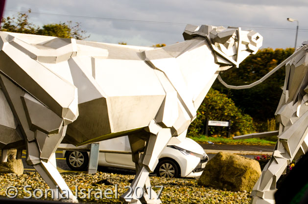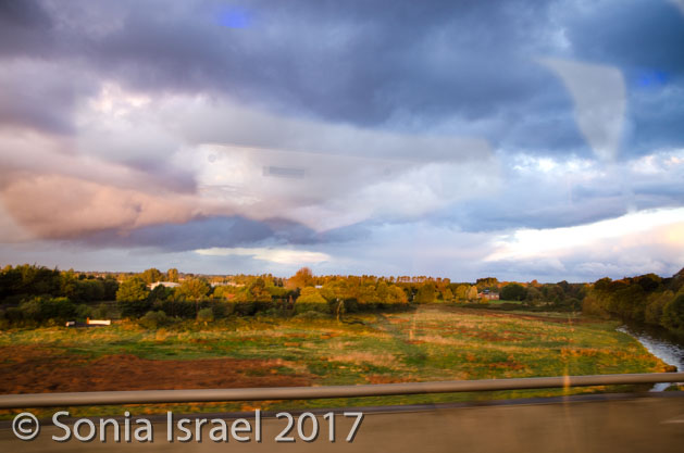 The motorway here has two lanes. Here in the Republic of Ireland, signs are both in English and Irish. Maximum speed for cars is 120 km (74 miles), but for buses 100 km (62 miles). The median is filled with sculptures such as large bee hives and cows, but the bus was going by too fast for pictures. We saw the sun rise. It rises late here. And it was beautiful.