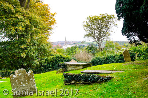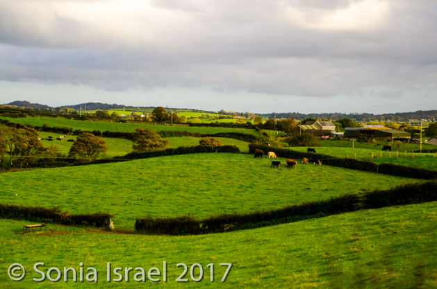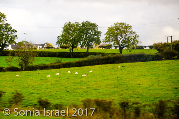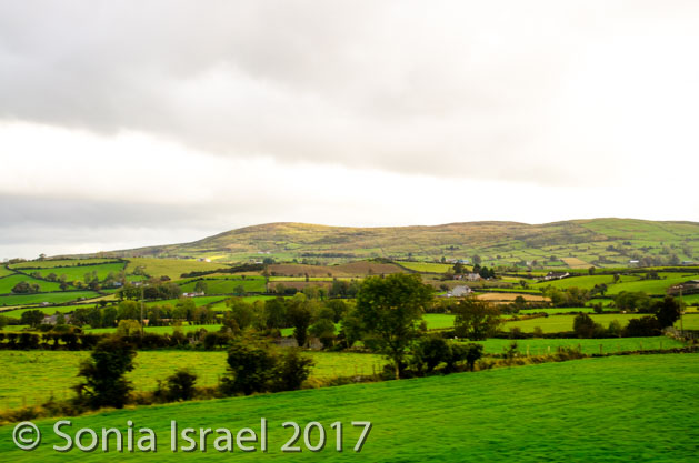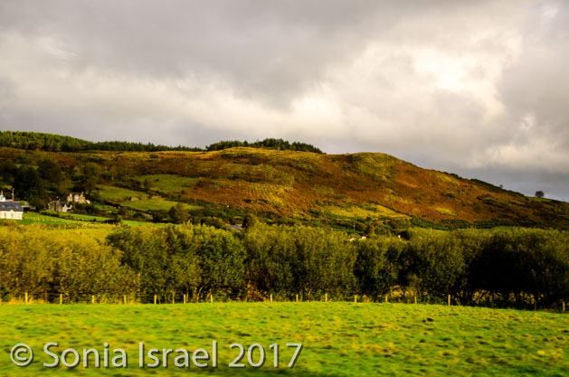 The hills were literally rolling. The mountains were covered in trees in fall colors. The sky turned blue as we crossed into North Ireland. And that combination of colors was awe inspiring. We passed lakes. We passed a church and/or cathedral in every village and each had an old graveyard by its side. Each village had colorful houses lined up on the main street.