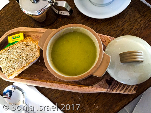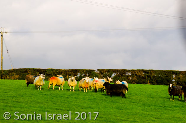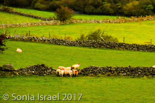 We left the motorway and drove on narrow country roads. Farms are everywhere once you leave the city, and grass is the most common thing grown. And speaking of farms, they are absolutely beautiful as you drive through the country side. There are green fields, shades of green like you have never seen, and they are dotted with white sheep and cows grazing (there 4.5 million sheep here). And the sheep all looked like they have been painted in red or blue or yellow or green. In fact, they have been. Each farmer marks his sheep in some pattern to they can identify which are theirs. And the farms are divided with old stone walls which make the hills looks like checker boards.