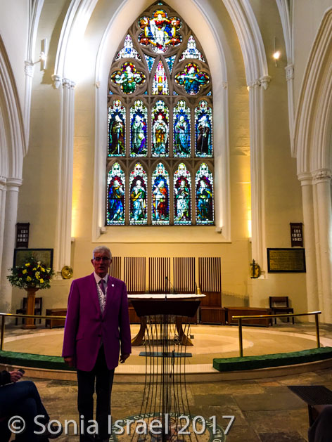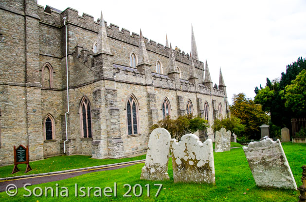 And we arrived in Downpatrick where St. Patrick is buried. It was Sunday, so everything was closed, and mass was being conducted in the Cathedral (yes, also called St. Patrick’s). We stopped in the visitor’s center where we watched a video about St. Patrick. From there some of our group went to mass and some of us walked around looking for a place to have lunch. Unfortunately, the only thing open was Subway. You can travel far and still end up in the same place! Andy and I walked up the hill to the Cathedral and walked around the grounds, looking at St. Patrick’s grave and the old grave of others. It was bitter cold so we entered the Cathedral and sat in the vestibule, eating cookies and listening to the service. Once it was over, an older gentlemen in a purple sports jacket with a purple tie told us the story of the Cathedral. And by now we had heard this story of St. Patrick so many times, that watching him was really the best part.