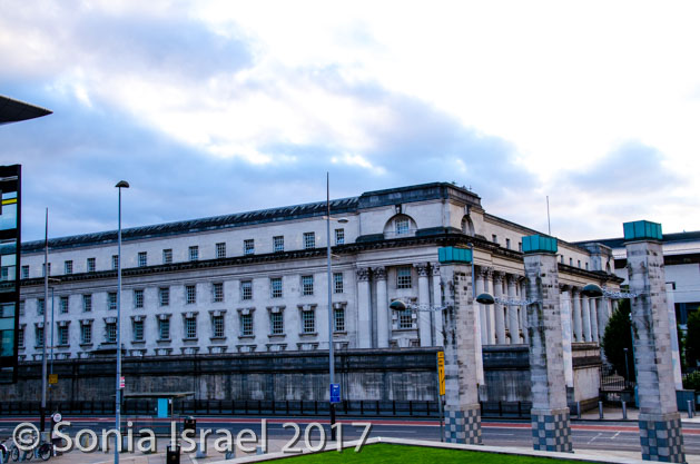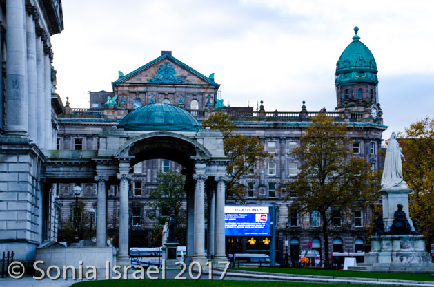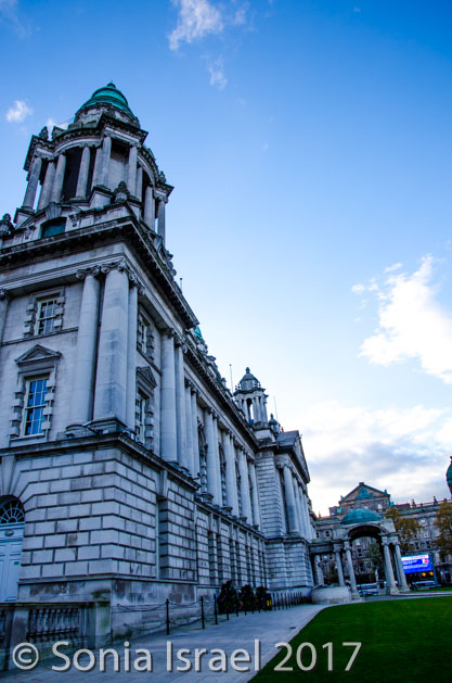 We pulled into our hotel, the Belfast Hilton, which was across the street from the court, behind the concert hall, and just a few blocks from City Hall and City Center. We had about an hour to ourselves, so of course Andy and I donned our jackets and went walking and exploring. We walked to the City Hall which I think is as beautiful as many of our buildings in D.C. Interestingly, while the courts had walls and cameras (even to this day) protecting it, City Hall did not. That is because the trials took place in the courthouse and not City Hall.