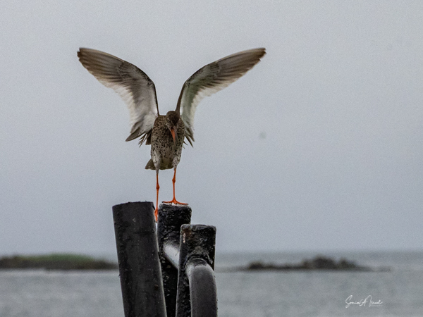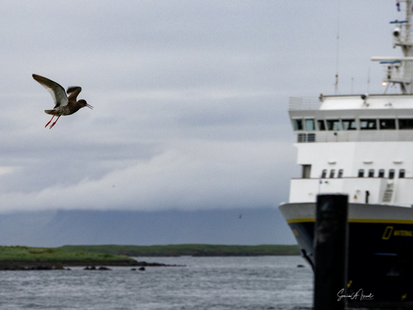 When we embarked off our zodiacs onto land on Flatey Island, the first bird we saw was a redshank. I couldn’t miss those bright orange spindly legs and the orange spot on it long, thin black beak which they use to reach into the ground to find their favorite food, invertebrates. Seeing the redshank right away should not have been a surprise as it is estimated that there are over 75,000 breeding pairs of redshanks in Iceland. In Icelandic, the bird is called “steklur” which means stalk, referring to the bird’s long and slender legs (the better to wade with in ponds and on the shores of the sea). In Danish “Rodben” means red legs, although the Icelandic version of the bird has orange legs. The rest of the bird is more brownish but almost in a speckled or striped way.