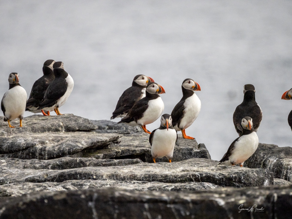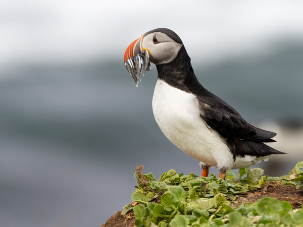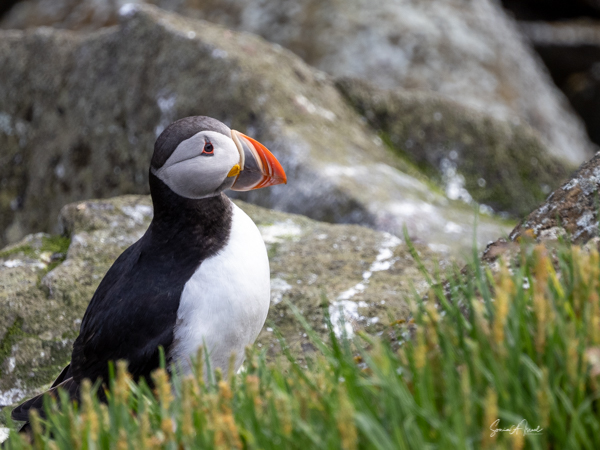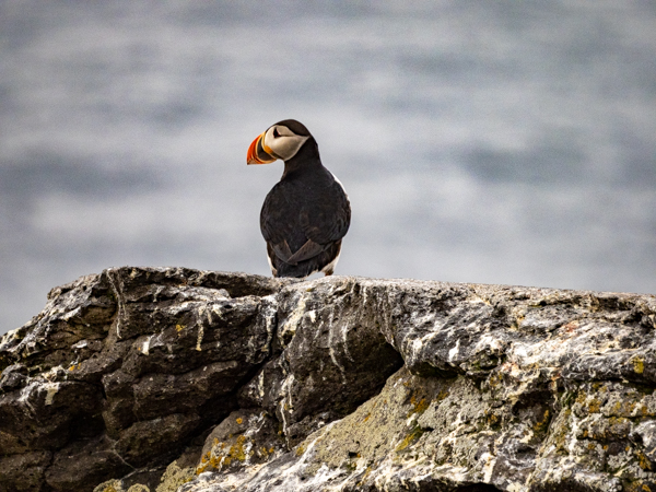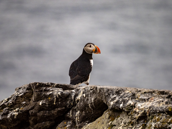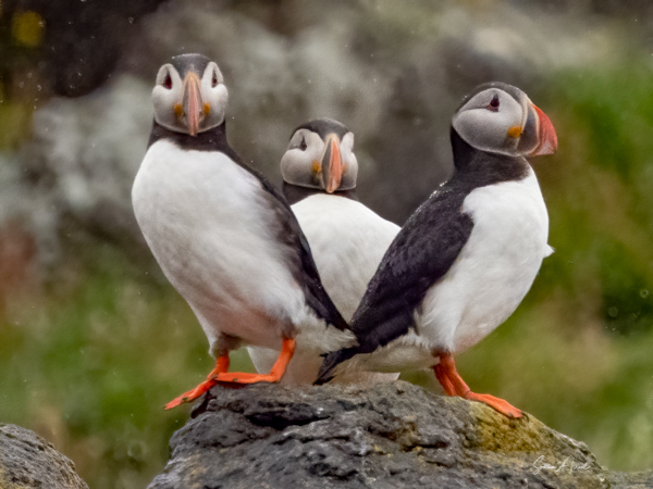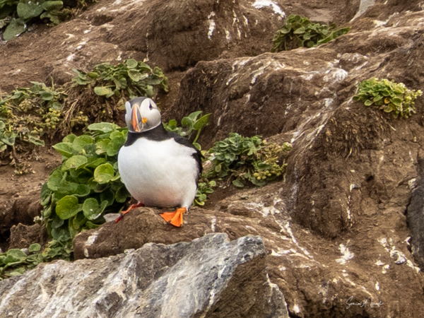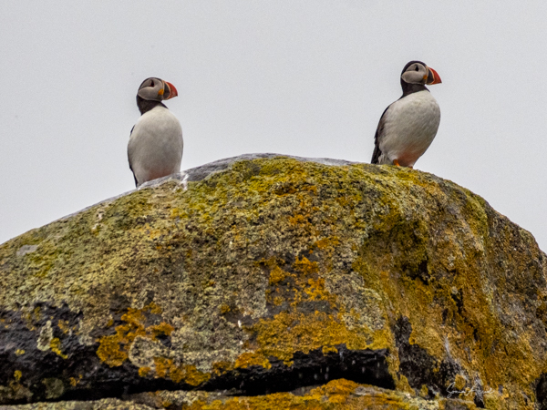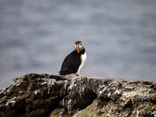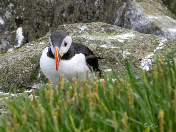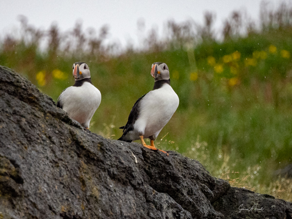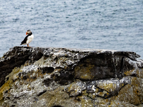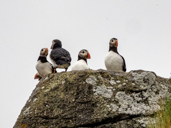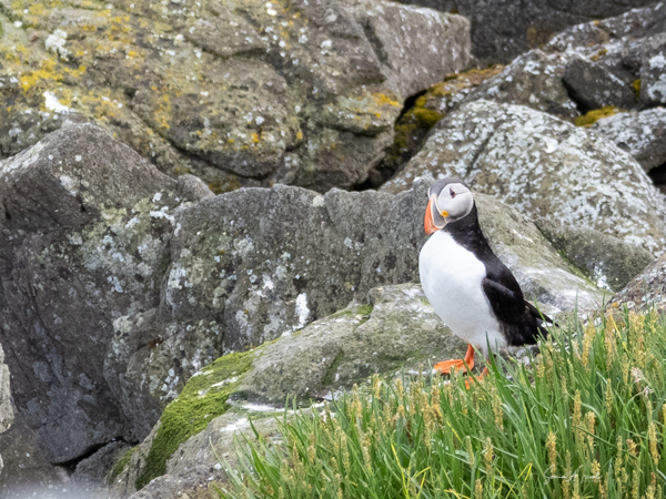 Footballs. They look like black and white footballs. While penguins, to whom they are often compared, are sleek, puffins are stocky with large beaks that look like they should fall over. Like penguins, their bodies are black and white, black on top and white on the bottom which protects them from predators both from the sea and from the sky. During the breeding season, their beaks turn a bright orange. Interestingly, the rest of the time, they shed their bills which leaves a smaller and duller beak. Luckily we were here during breeding season.