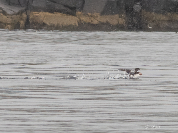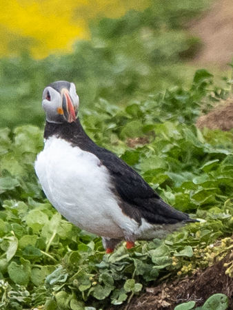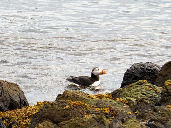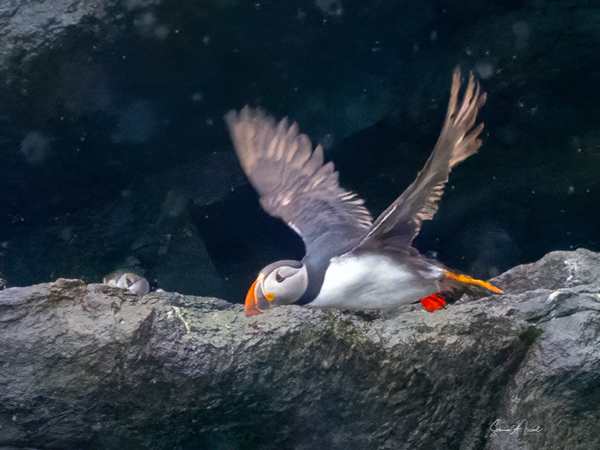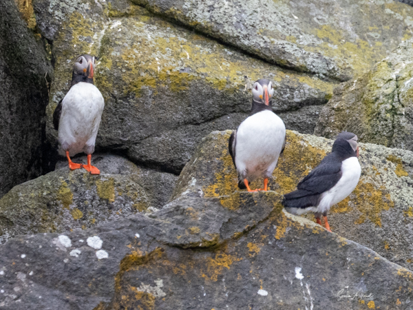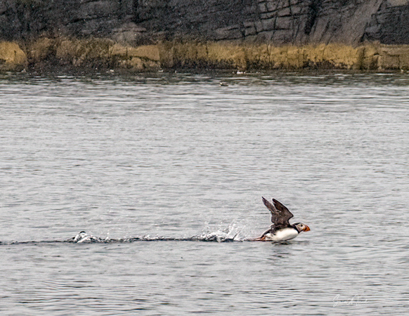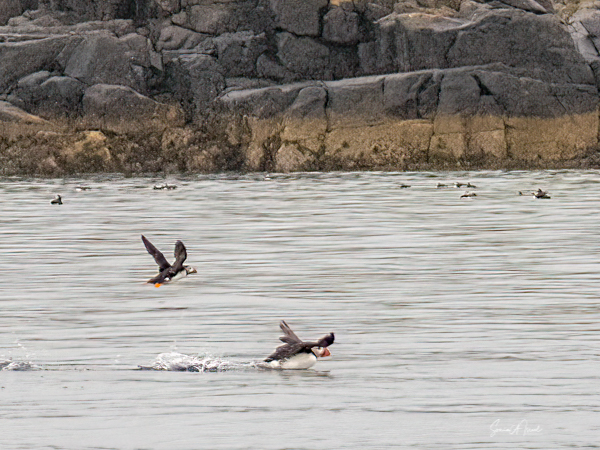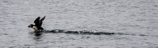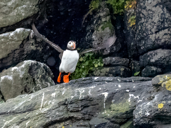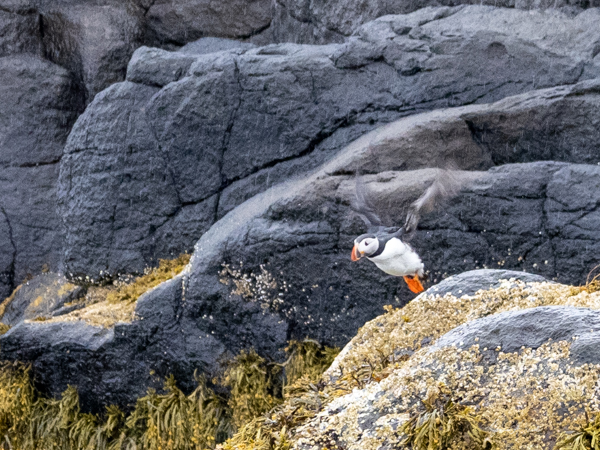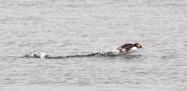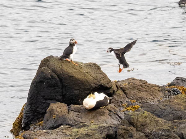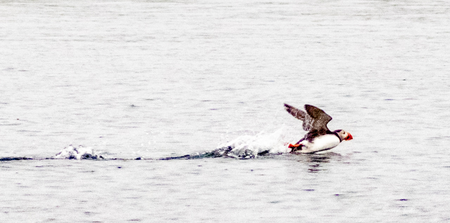 Although puffins spend most of their lives on the water, they are still called the clowns of the sea. That may be in part because of their bright orange beaks. But more likely it is because of how they take off and land both of which have been described as a comedy routine. I watched them take off and land for many, many minutes at all the different sites. To take off, they get a running start. You see their little orange-red feet running as fast as they can, on land or on the water, and then they flap their wings and take off. Yes, they can actually run on the water! And when they land, they seem to stop in mid-air, put their orange-red feet down below them, and like a helicopter, settle down onto the ground. If they are landing on the water they look like they are doing a belly-flop or tumbling and rolling on the surface of the water. I must admit they were quite funny to watch.