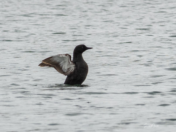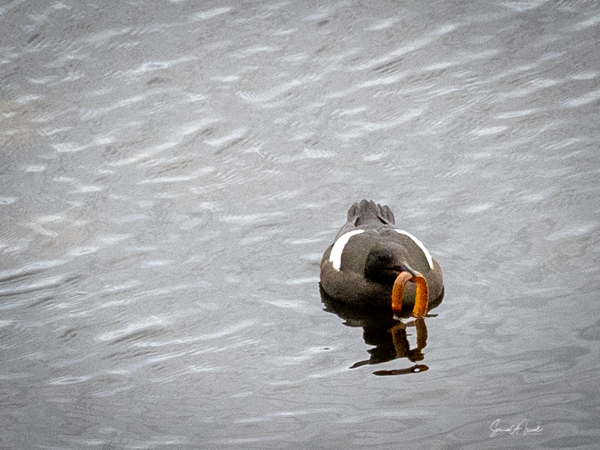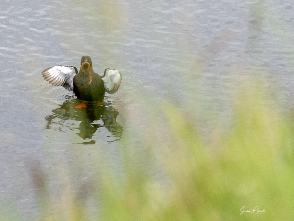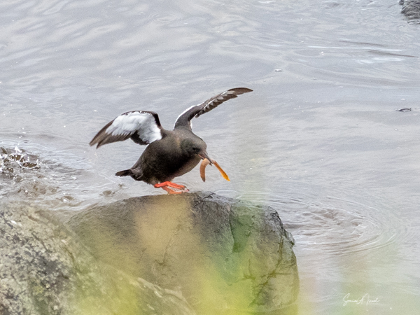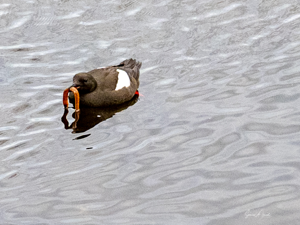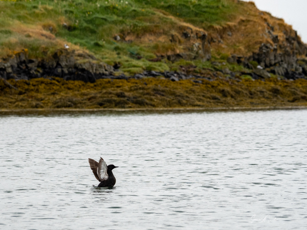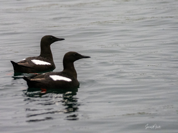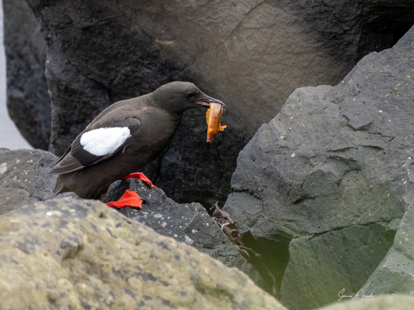 The black guillemot (or tystie) is another bird we saw everywhere. They are easy to identify as, as the name suggests, they are all black except for a white patch on their wings and white on the underside of their wings during the breeding season. In the winger they became all white below and specked and brown and white on top to camouflage into their surroundings. Their beaks are always black and pointed but they have bright red legs. They are on the small side at about 14 inches long with a wing span of about 20 inches. They can dive very deep and feed on the bottom of the sea. And once they catch their fish, they can hold them in their beak for hours. I watched one doing just that.