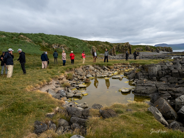 After touring the entire island (don’t fret, it is a small island), I finally left the group and wandered on my own heading up a dirt path to the cliffs of Flatey as that’s where I heard the I could find puffins. After about a 15 minute hike, I reached the cliffs where some of my fellow shipmates were sitting on the grass, some snapping pictures and many just watching. I picked a rock to sit on and tried to look over the edge, but still didn’t see much. Two young men from our ship invited me to sit closer to the edge, on the grass. I told them they would have to help me up if I sat down there. And they promised they would.