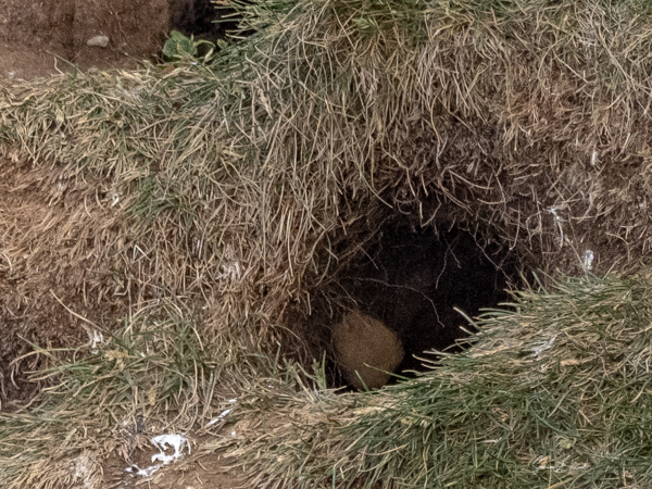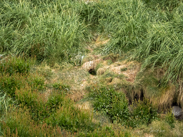 It is the male puffin who digs a 5-6 feet long burrow (or tunnel) into the soft soil and builds their nest there, lining it with grass, leaves and feathers. Sometimes they will breed in rabbit burrows. Why do all that work of digging if someone else has already done it? Each year they return to the same burrow.