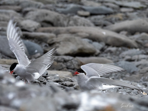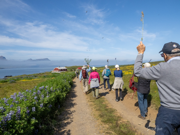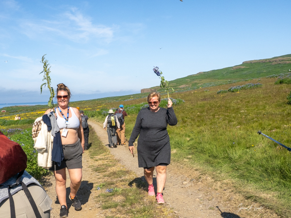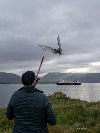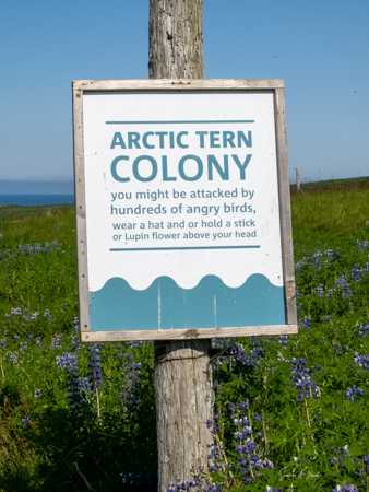 Arctic Terns are in the Laridae family and ‘family’ is a good term for them. We were here during breeding season and the terns are extremely territorial and protective of their eggs, which are very well camouflaged in a small depression in the ground, and of their young (as they should be!). On several islands, as we came within range of their nests they began flying and screeching and attacking us. Yes, attacking us. We were given sticks to hold up as the terns will attack the highest point. Better the stick than your head. On the island of Skalanes, we picked Lupins to hold up high.
