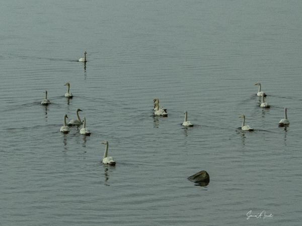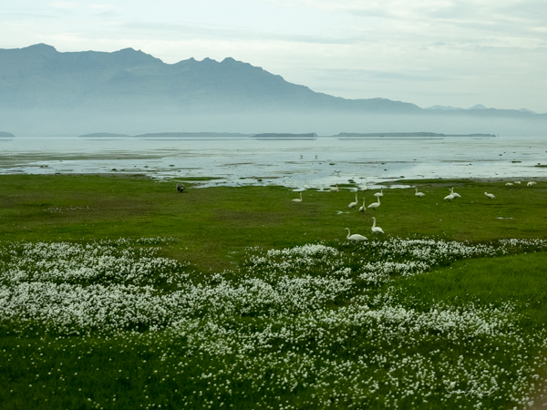 There was one day when we drove along the Eastern coast on our way to Fjallsarlon to see the glacier and ice bergs. On the way we passed the Alftafjorour which means “Swan Fjord,” called that because there can be thousands of Whooper Swans (pronounced hooper) there at any given time. The farmers in that area are not wild about them as the swans go into their field and attack their sheep, but they are protected so no one can harm them.