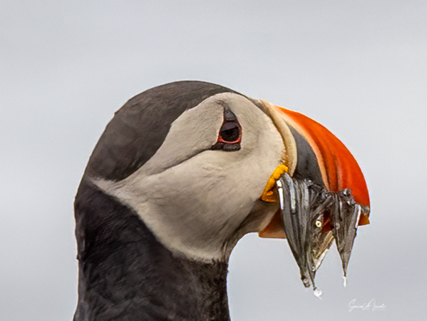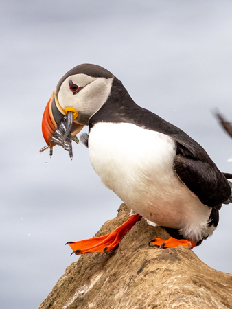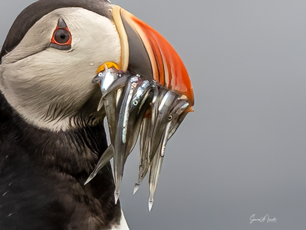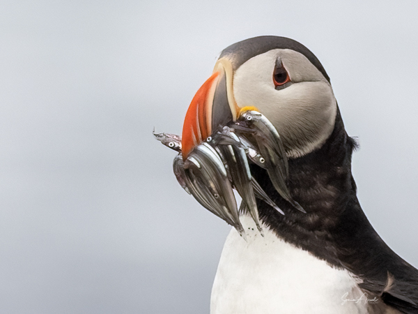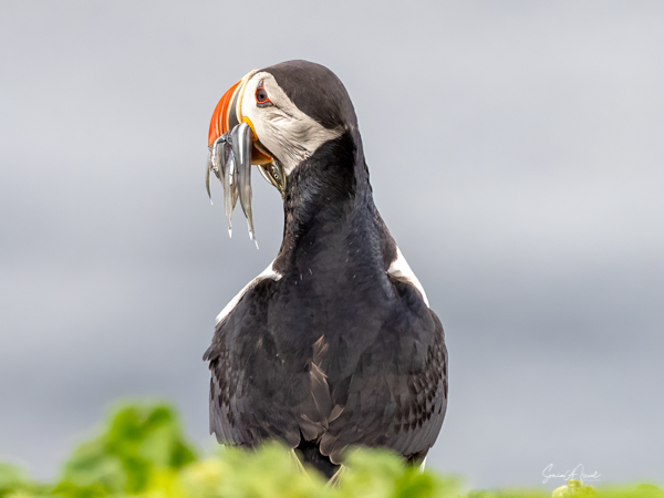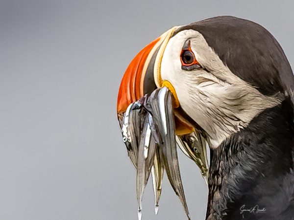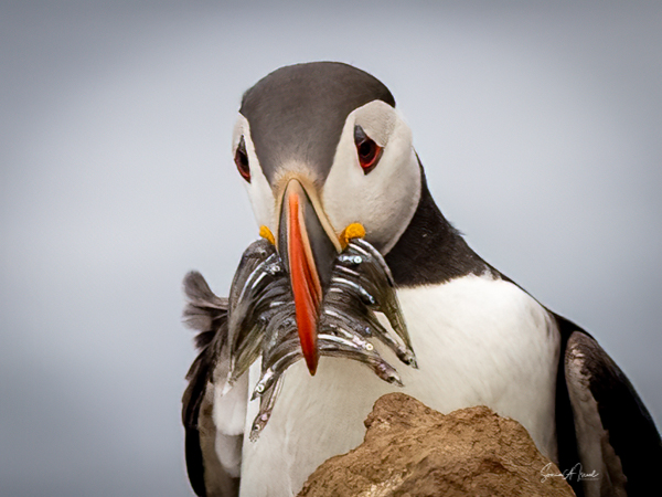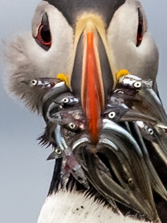 Puffins eat fish and zooplankton. They might dive down 200 feet in search of fish. But when it comes to their puffling, they feed them small marine fish several times a day. Unlike other birds, they do not regurgitate swallowed fish for their puffling but feed whole little fish directly to young. Only later might they drop the fish on the floor of the nest. But that means they have to constantly fly back to sea to catch enough fish. And catch them they do. I often saw them flying with over ten fish hanging crosswise from their mouths. How do they do that? They have a unique hinging mechanism in their beaks which allows them to place their upper and lower biting edges of their beaks at all different angles. This also allows them to hold on to fish they already caught while diving for more. Seeing them fly with these fish hanging out of the beaks is an amazing sight.