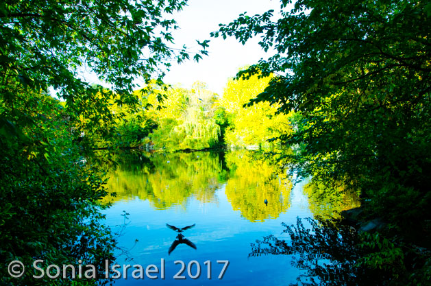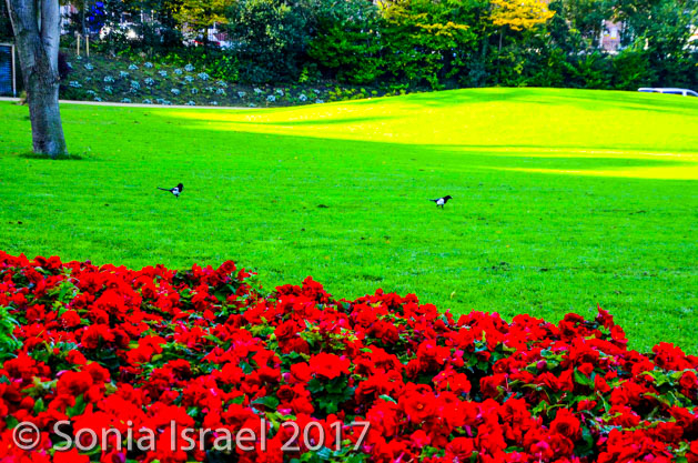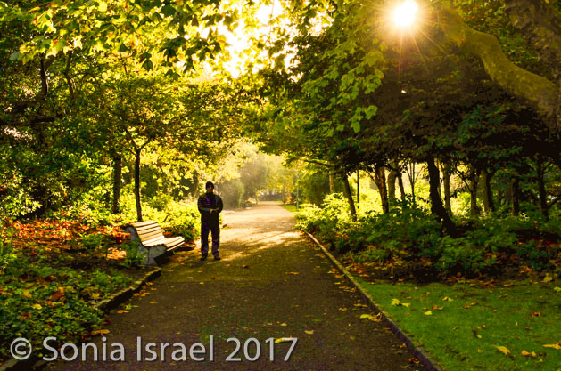 From here we walked to St. Stephen’s Green. St. Stephen’s Green is much larger than Merrion with even more playgrounds, flowers, fountains and sculptures, including another one called Famine. There were ponds with ducks and swans, and beautiful trees in yellow and orange and red, reflecting in the water. Stone bridges arched over the lakes. Birds flew everywhere.