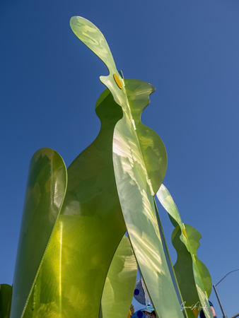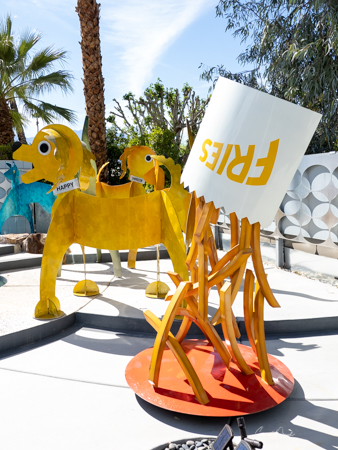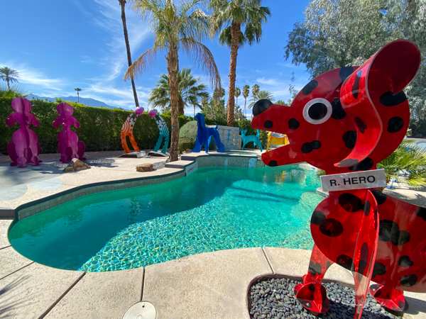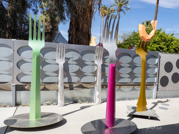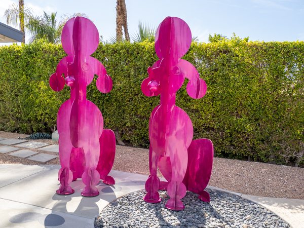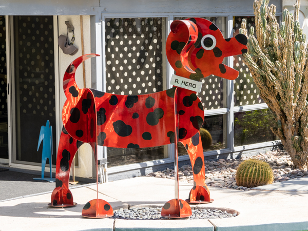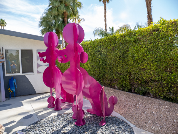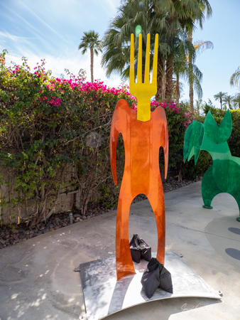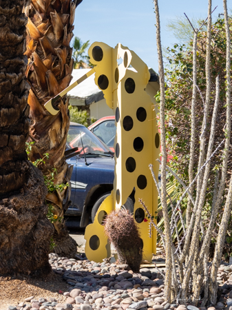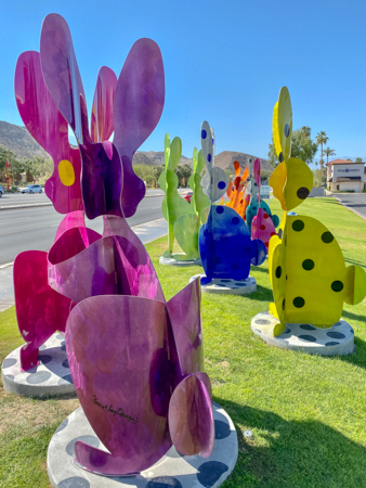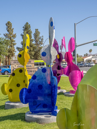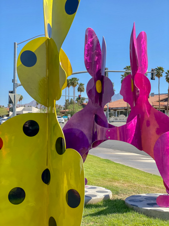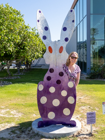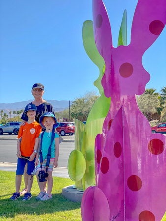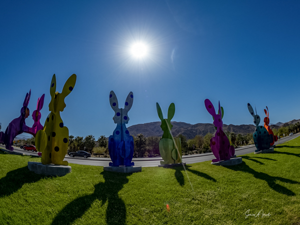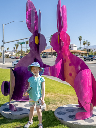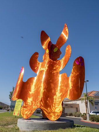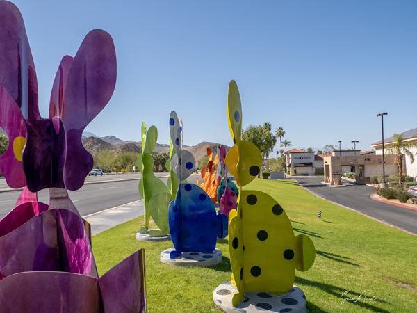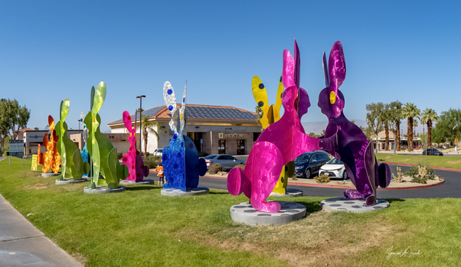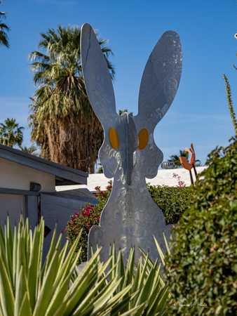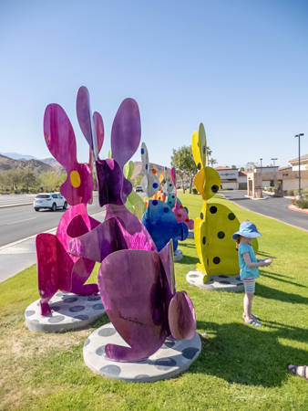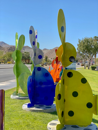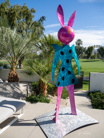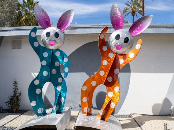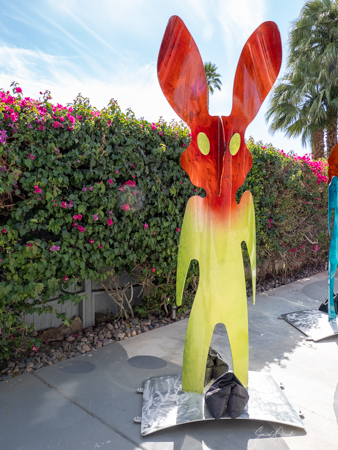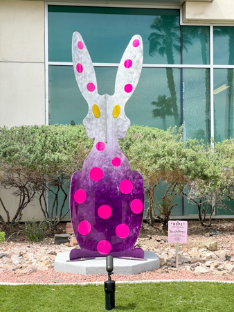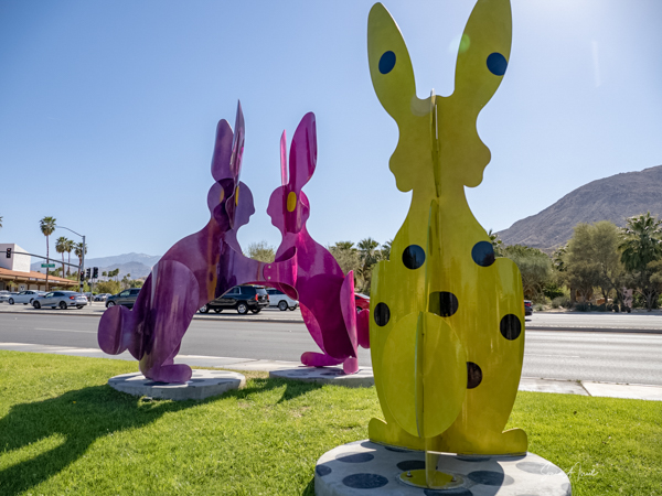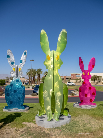 The rabbits stand 7 to 8 feet high in vibrant colors, some solid, some with polka dots. They are all over the Coachella Valley, but we went to the one called, Desert Warren 2 in Palm Desert. [Note – if you click on the photos, not only will they get bigger, but you can see the names of the sculptures.]