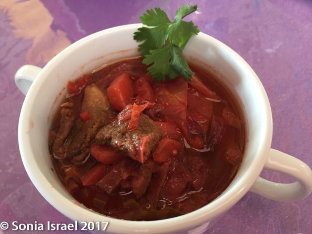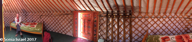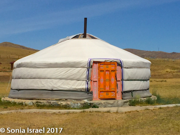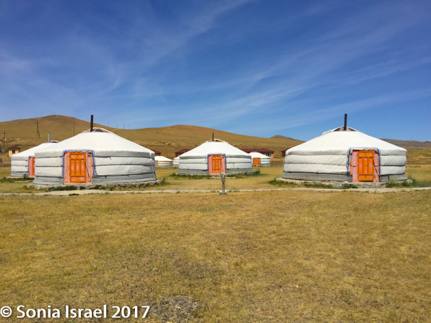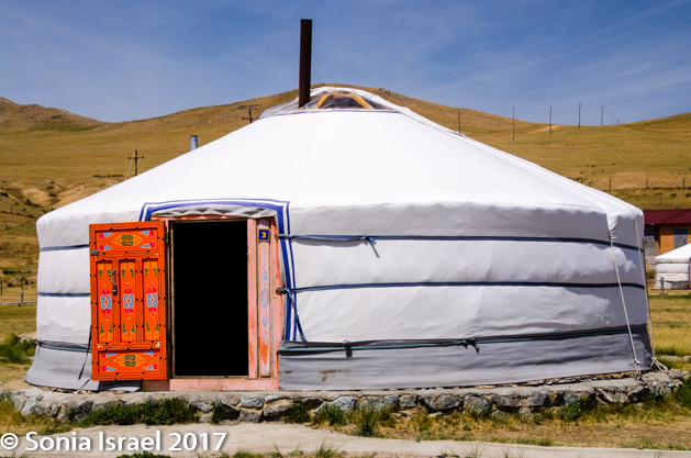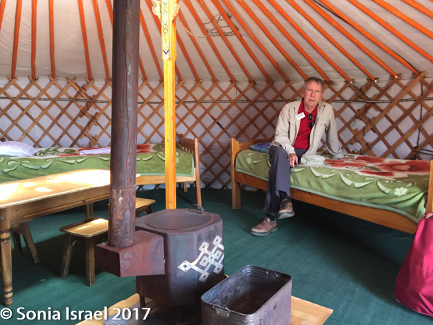 luggage was taken on a cart which was pulled by one of the men working there and each suitcase was delivered to the appropriate ger. The gers were set up in two straight rows, like soldiers standing at attention. Each ger had a brightly painted and decorated orange door. There was a main dining hall and a common shower and bathroom facility. It reminded me of the old days of Israeli kibbutzim when everyone ate in the dining hall and everyone shared the showers. Here it was important to have a flashlight if you wanted to get up at night as the only light came from the millions of stars up above…and from the lights lining the walkway.