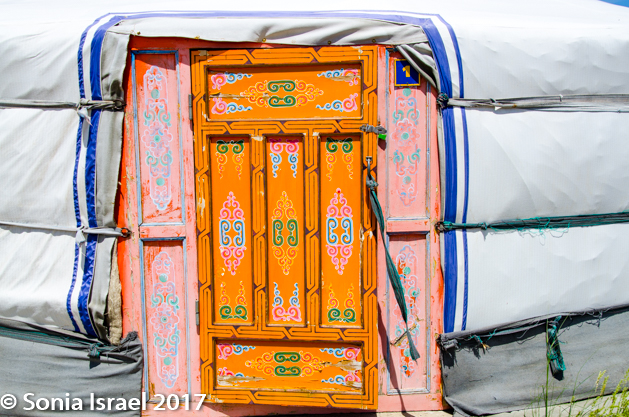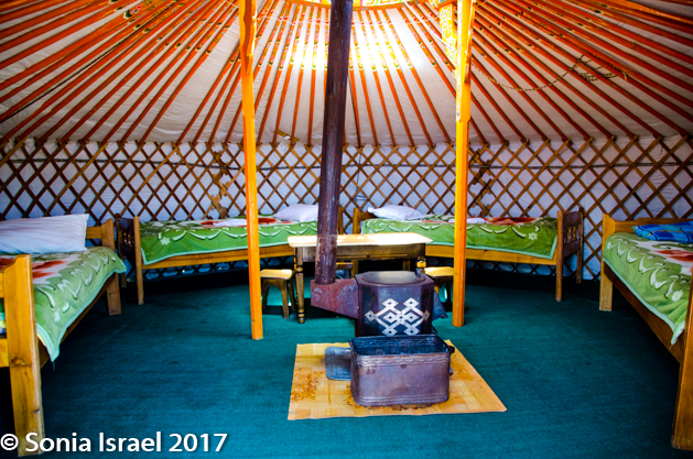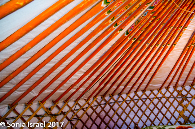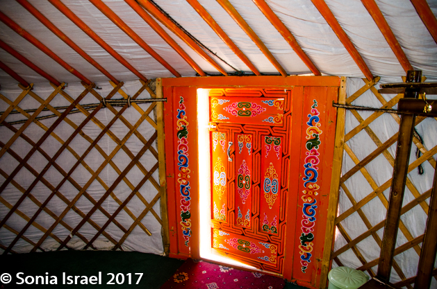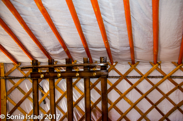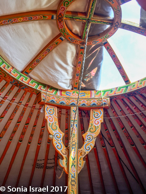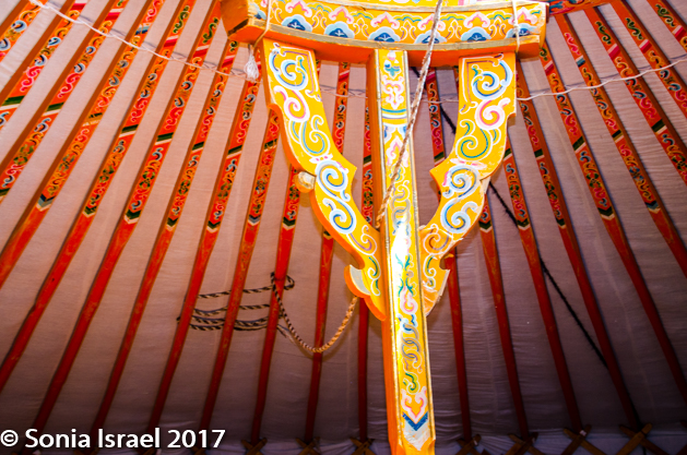 When you get to your first ger, the first thing you learn is to duck as the doorway is always low. Even I, at only 5’2” had to duck my head. This ger was simple, but had all we needed. We had four single beds lining the walls and a wooden stand with a few hooks. And one single light bulb hanging in the middle which at night was turned off as there was no electricity. In the center was a wood burning stove. And there were two larger posts, shaped like a slingshot, holding up the “wheel” window, the toono, at the top and decorated in all colors with beautiful designs.
