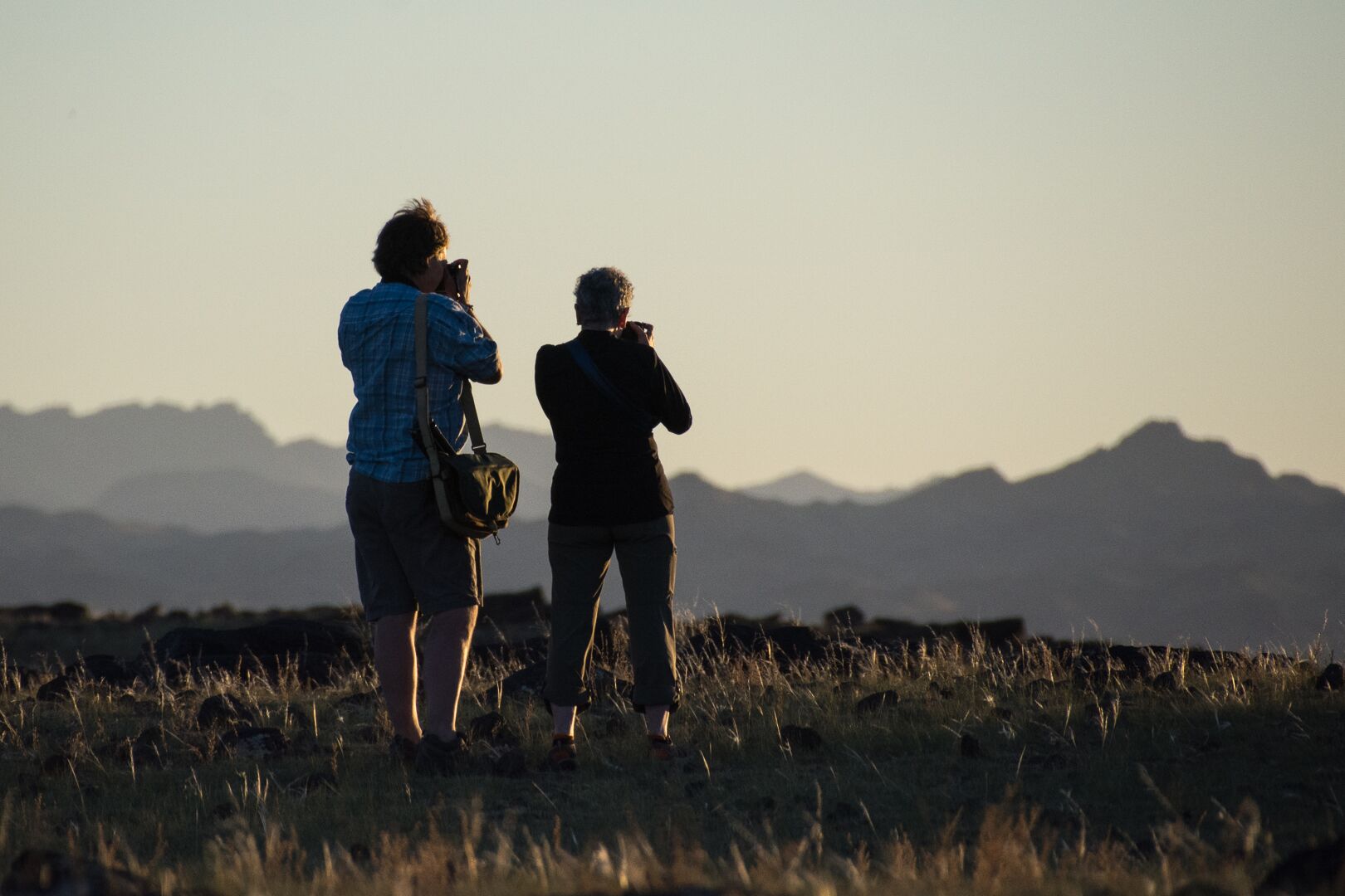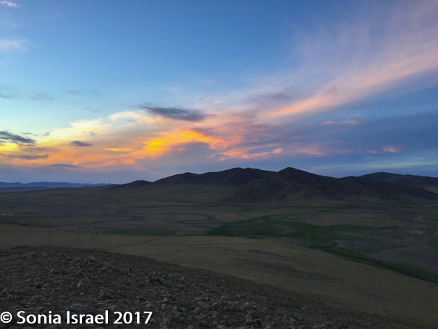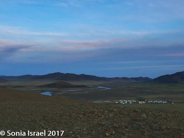 The sun was setting. The eternal blue sky was turning colors. And the dust just snaked its way around the bends. The three gers with their red doors stood out against the brown mist.
