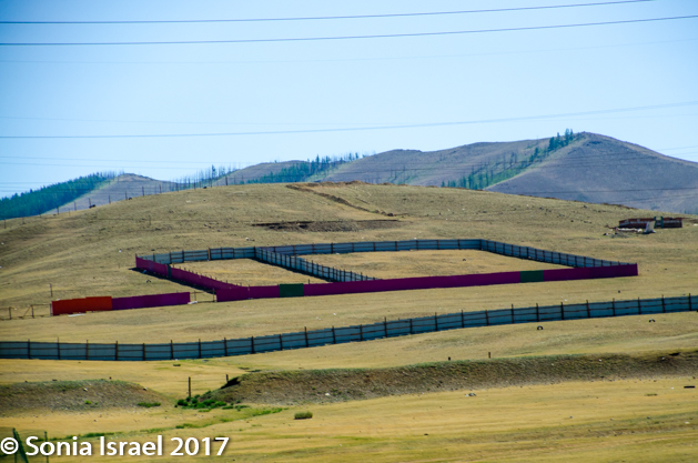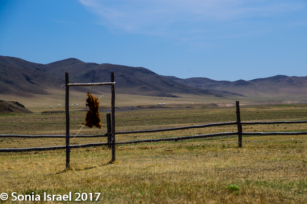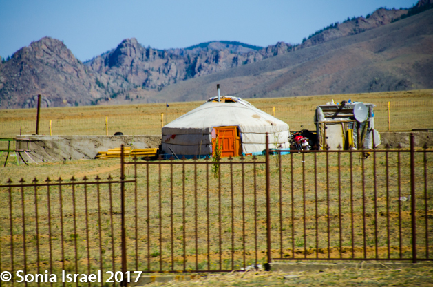 Out in the desert and in the steppes, or anywhere outside of UB, the gers are isolated from each other. But close to the city, the gers are surrounded by fences. And if they don’t have a fence, they use half tires stuck into the ground. Each Mongolian adult is given 0.7 hectares (about 1750 acres) within the urban centers, by the government for a term of 15-60 years. This is your land and you can sell it if you want. Azaa has her piece of land as does her husband. Some families have permanent gers on their land.