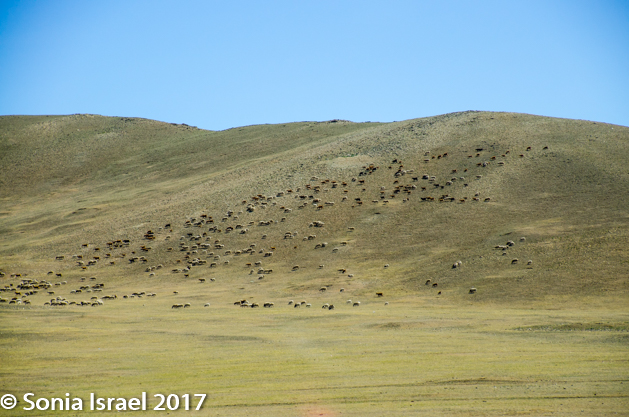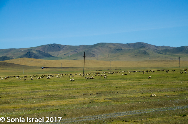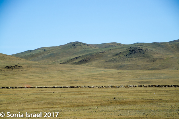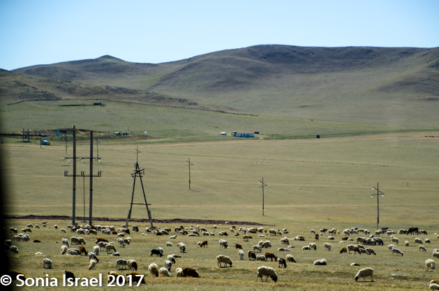 The land around us was still brown but there were mountains on the horizon. And although the mountains too were brown and barren, on the top ridge there were sometimes lines of trees. The houses became farther and farther apart and we started seeing more and more gers, although those were not close to each other either. The country side was dotted with herds of goats and sheep, and as we got farther from the city, horses, cattle and even camels. Now we were in nomad country. Someone said that the flocks of sheep were of biblical proportion!