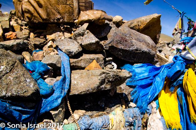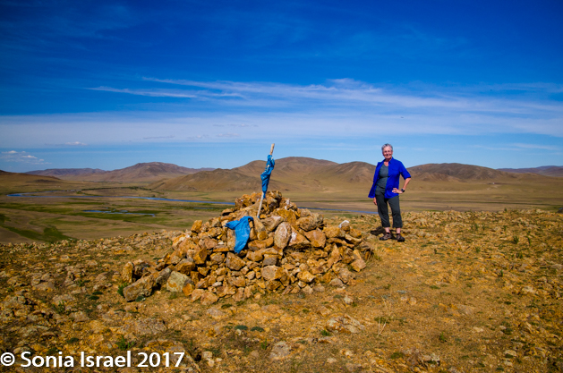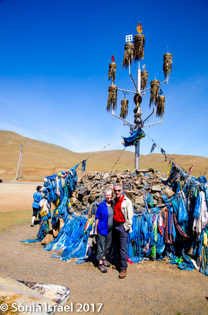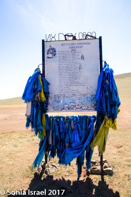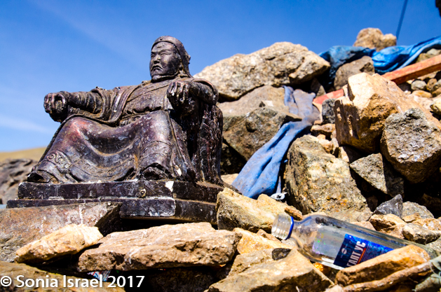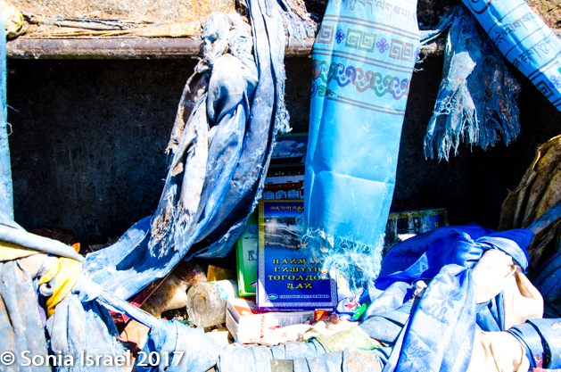 We had been on the road for about 1.5 hours at this point so it was time for a break. We stopped at an Ovoo. Ovoos are traditional monuments usually made of mounds of rocks, often covered with prayer flat where the Mongolians and other travelers stop to bring offerings for good luck. A Mongolian is never supposed to pass one without stopping. The offerings could be money, strands of a horses hair, or just about anything. When you stop at an ovoo, you walk around it three times in a clockwise direction and add stones to it. It is believed to be linked to the mountains and the sky. We walked around it looking at all the items that had been offered. There were wooden beads, a small brass pyramid, money, a drum, lots of ribbons and prayer flags, scarfs, a Genghis Khan statue, and an empty liquor bottle. Perhaps the alcohol had been poured on top. Or maybe it someone drank it.