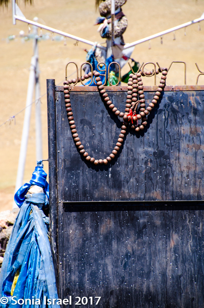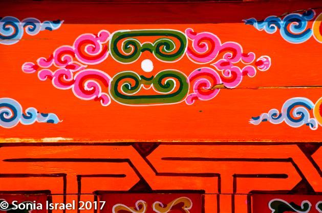 But the overall visual effect of these gers with fences around them is that of boxes of different sizes all trying to fit together like a puzzle. And then there are the colors of the villages. The metal roofs, as we noticed on our first day, are orange, yellow, red, blue, green. A rainbow. And the colors all symbolize something. Blue is the eternal sky. Red is fire. Orange prosperity.