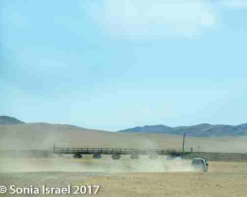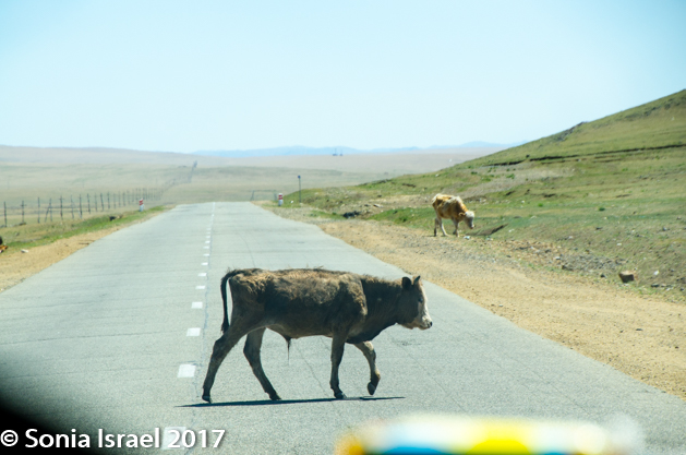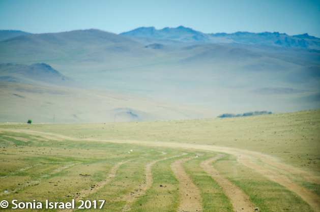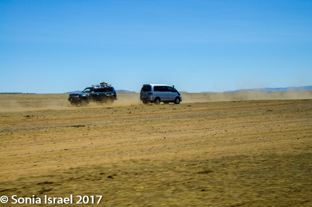 The landscape kept changing and now we were in the steppes. There was no road. Each car would make its own tracks and the others would try to follow. But every once in a while, a car would break loose of the caravan and go careening down making its own new tracks. And if there were horses or goats on the “road,” we would just drive around them. There was a time when the tracks were just made by the horses. Today it is mostly cars.