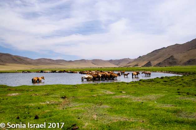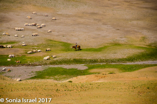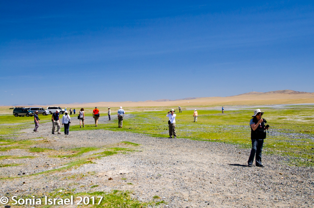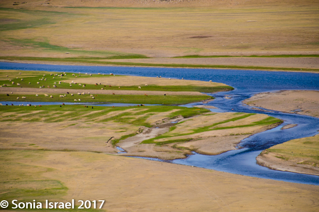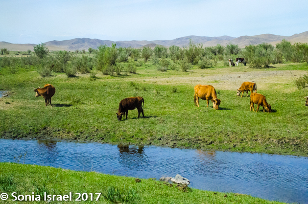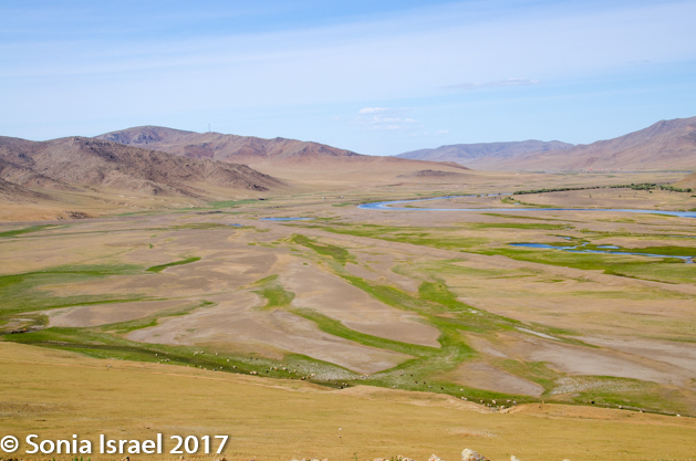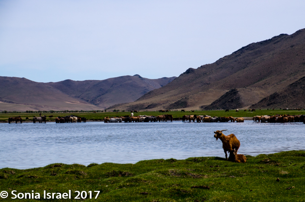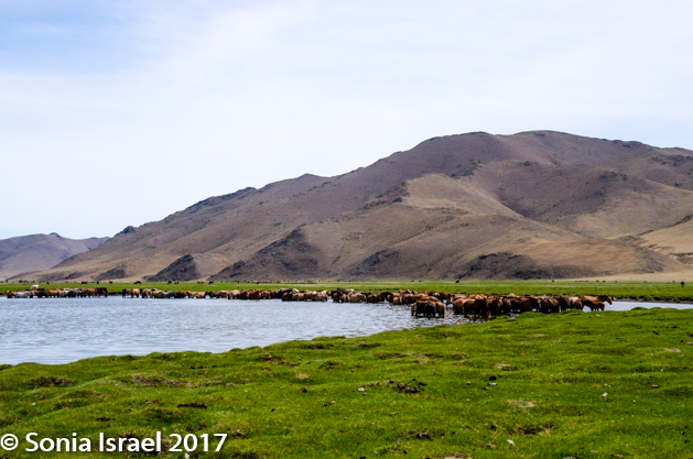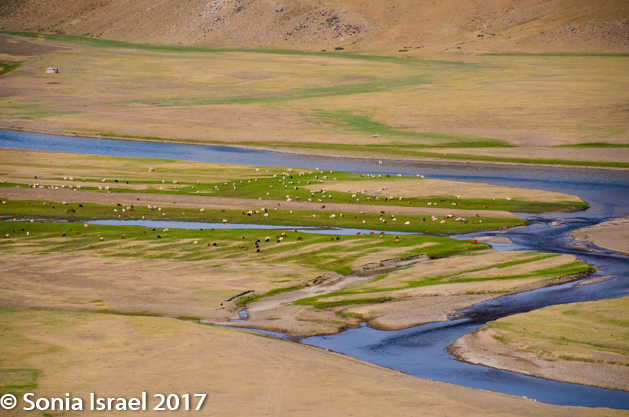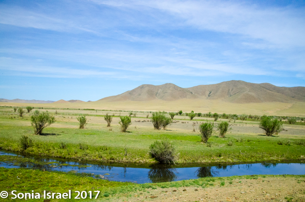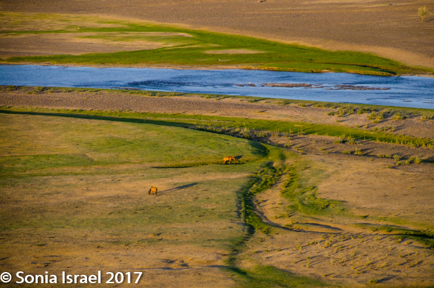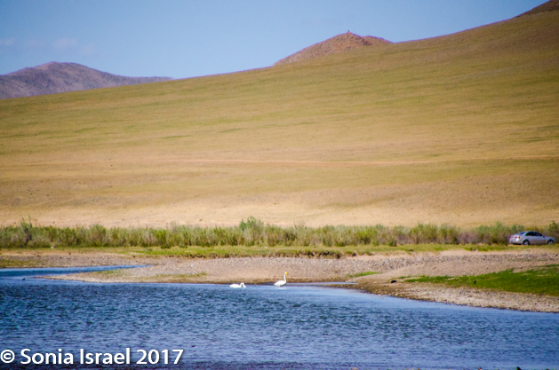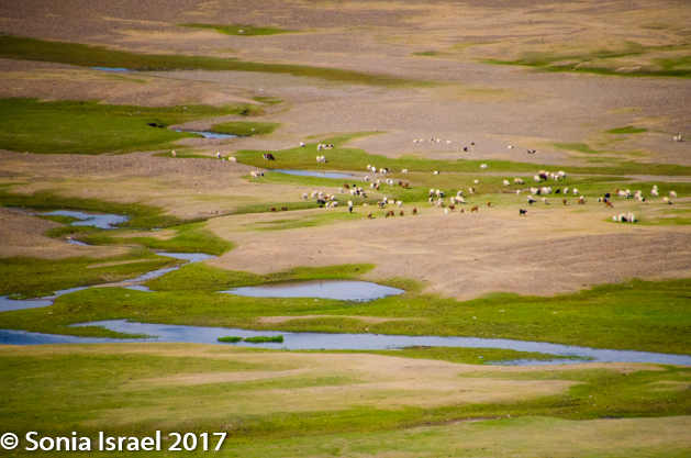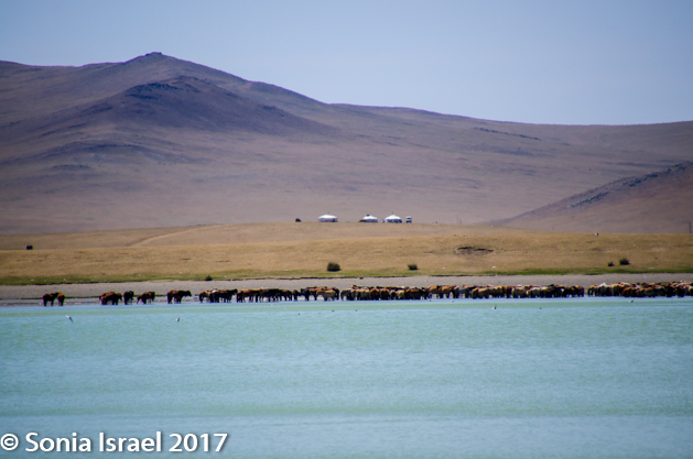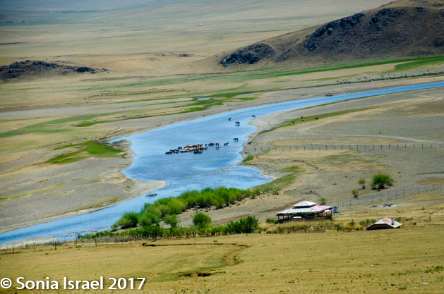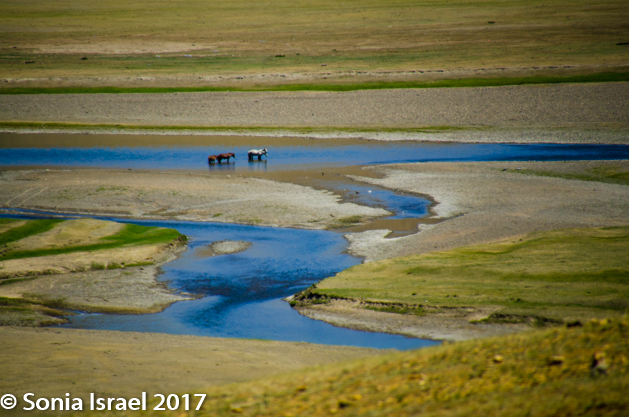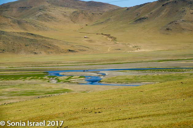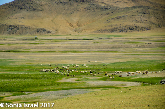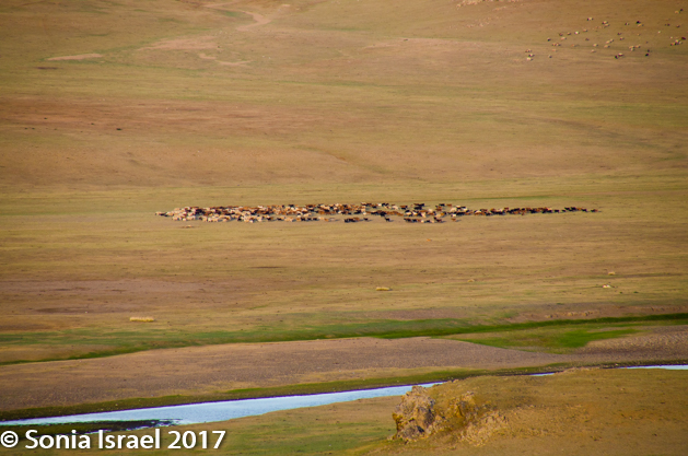 Gün-Galuut Nature Reserve has a great diversity of ecosystems even though it is a comparatively small area. It is filled with high mountains, steppes, rivers, lakes and wetlands. As we looked around, it seemed that the steppes where meeting the sky with nothing in-between. Just a vastness, long empty spaces, with some undulating hills, spreading out as far as the eye could see. The vastness is impossible to capture on film although I kept trying.  One could understand why people once believed the earth was flat.  And the colors! Light green. Brown. Dark green. Shapes from the shadows of the clouds. Puffs of sand from cars. Stripes from multiple car tracks. And then herds of sheep, goats, cattle, horses, camels. But never intermingled. And then we would see puffs of wool caught on the plants. Like flowers or cotton. This is Mongolia and we would experience this feeling of vastness everywhere we went.