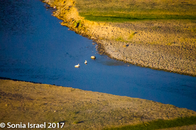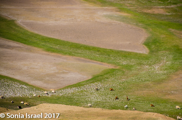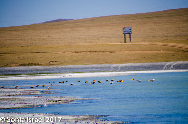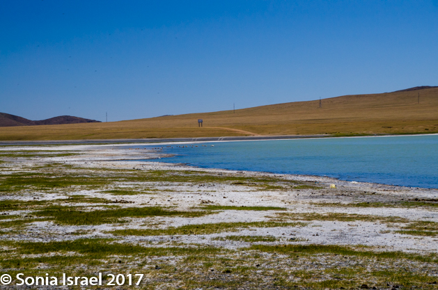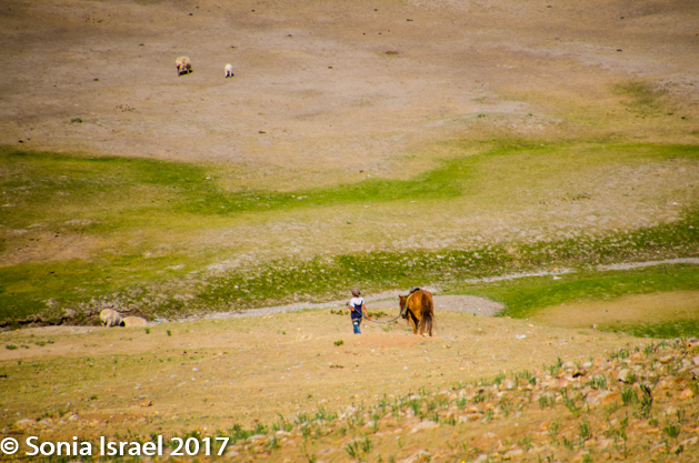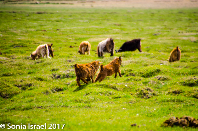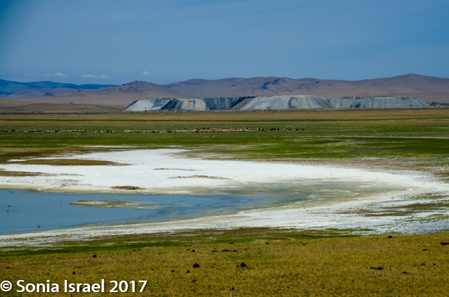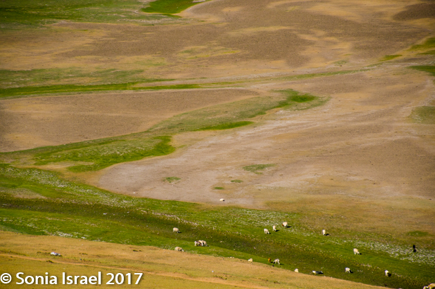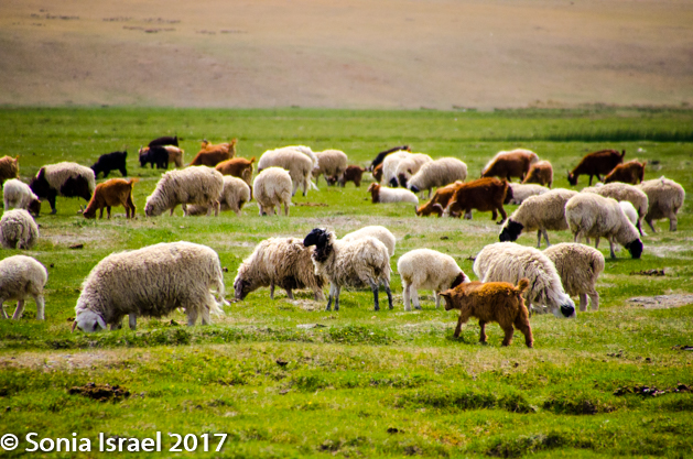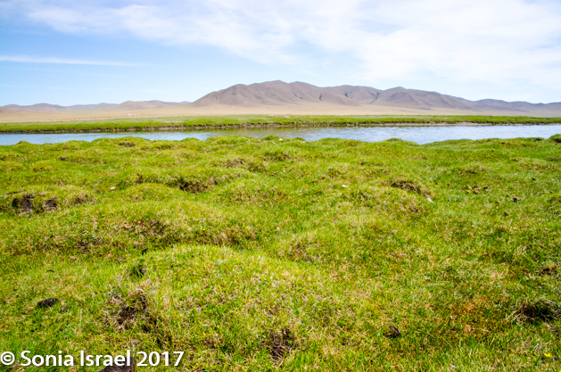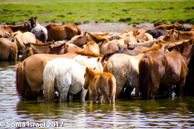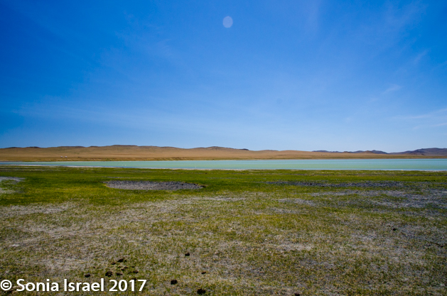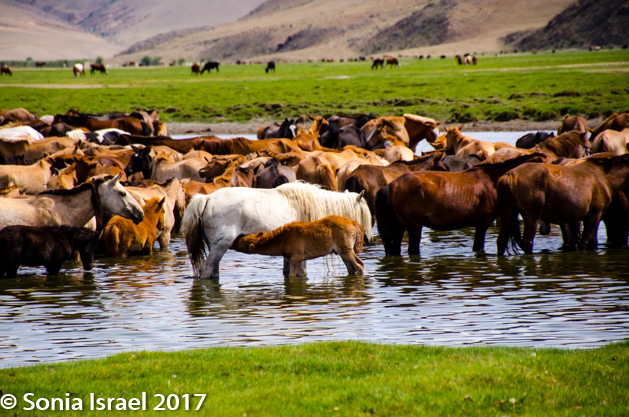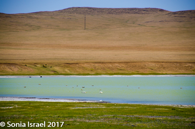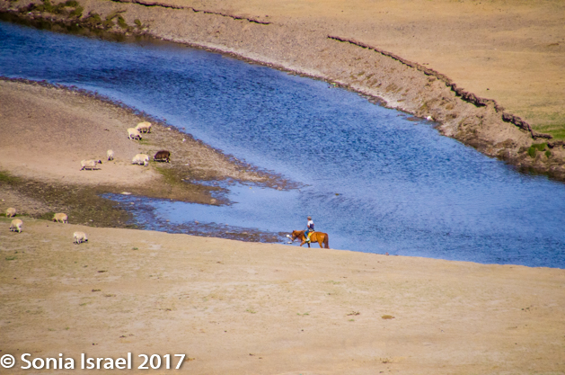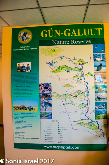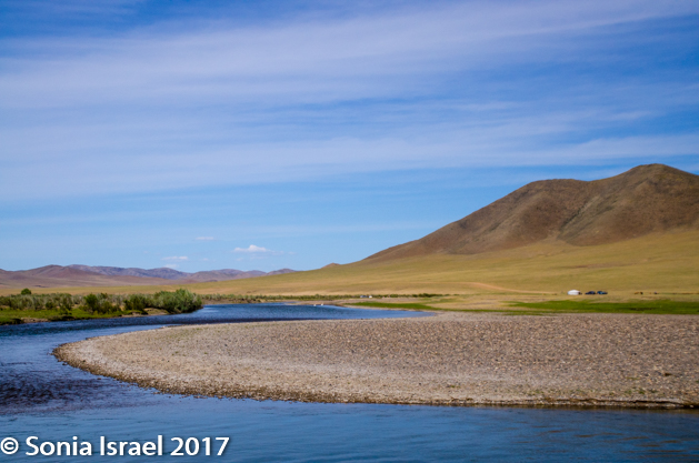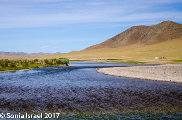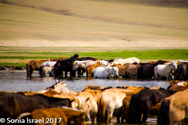 Gün-Galuut Nature Reserve has a great diversity of ecosystems even though it is a comparatively small area. It is filled with high mountains, steppes, rivers, lakes and wetlands. As we looked around, it seemed that the steppes where meeting the sky with nothing in-between. Just a vastness, long empty spaces, with some undulating hills, spreading out as far as the eye could see. The vastness is impossible to capture on film although I kept trying.  One could understand why people once believed the earth was flat.  And the colors! Light green. Brown. Dark green. Shapes from the shadows of the clouds. Puffs of sand from cars. Stripes from multiple car tracks. And then herds of sheep, goats, cattle, horses, camels. But never intermingled. And then we would see puffs of wool caught on the plants. Like flowers or cotton. This is Mongolia and we would experience this feeling of vastness everywhere we went.
