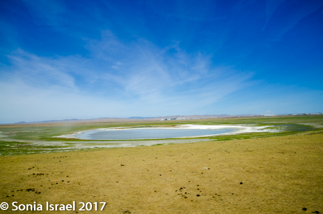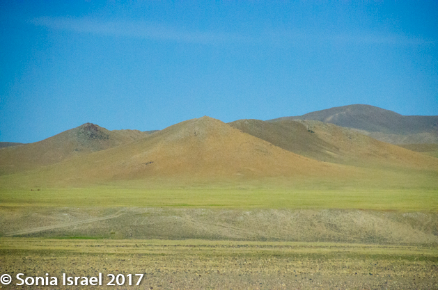 We kept driving. We saw more brown mountains. And then suddenly there would be a green strip of land and you would know there was a stream nearby. There were different terrains as we drove. There were stripes of green grass. There were valleys between rugged mountains. And then there would be flat areas with nothing as far as the eye could see. Long stretches with no herds and no gers. Looking arond one could believe that the earth is flat.