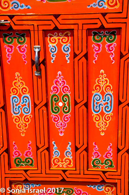 There is always a beautifully painted wood framed bed. There is a wood burning stove in the center with a pipe out the top “window” and there is a wooden door, often brightly painted and covered in designs. You never sit in front of the door.