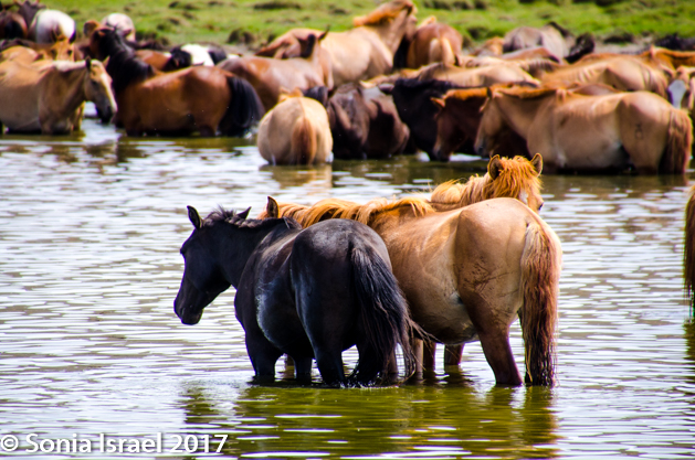 And then it was back into our cars and off to explore. We drove to a lake that was full of horses. Full. It seemed like close to a hundred, although I did not count them. The horses all stood around in tight groups just posing for us. They were brown and spotted and tan and a few white ones. There were foals nursing. And they just ignored us. And on the field next to the lake was a herd of sheep, running, grazing, jumping into the air. And also ignoring us.