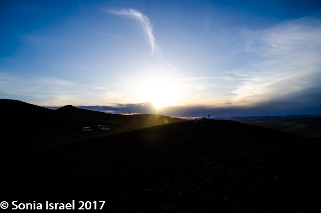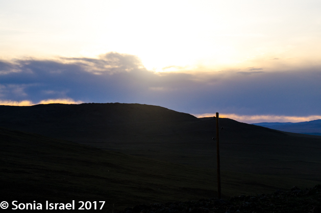 We didn’t stay there long, as we all wanted to watch, and photograph, the setting sun. We drove up the hill near the ger camp and settled in, most with tripods, and watched and waited. Below us were some streams with sheep, goats, horses and cows drinking their fill. On the other side was a snaking, s-curved road with three gers with red doors. And behind us was another mountain. There was an ovoo and it felt spiritual and quiet.