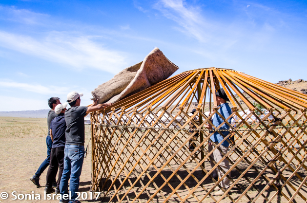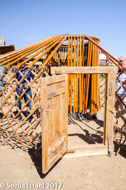 The ger is easy to take apart as the nomads do that at the change of each season, and while it used to be put on the camels or horses, today it is transported by trucks, which all seem to be blue. And true to the life of the nomad, they can be taken down or put up in about 30 minutes, put on the back of the horse or camel (or these days on the bed of a truck) and hauled to the next destination.