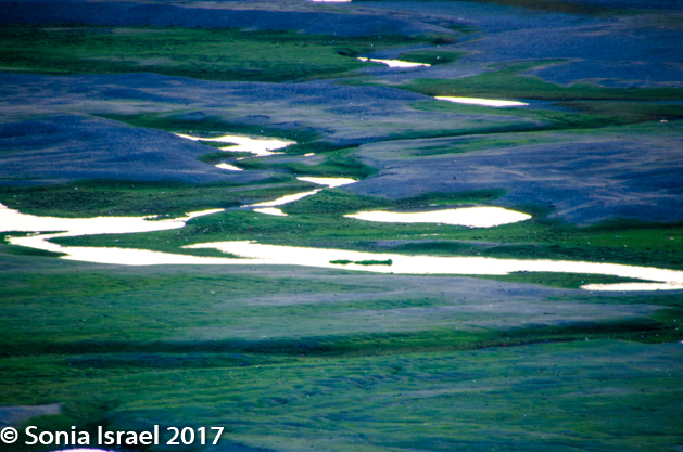 We stood marveling at the beauty of it all and then finally got back into the car. And as we drove alongside the river, a herd of horses ran by, with the foals trotting behind the mares, and all of them reflecting into the water. I shot through the car window which gave the picture a greenish tint, but nevertheless, I caught them.
