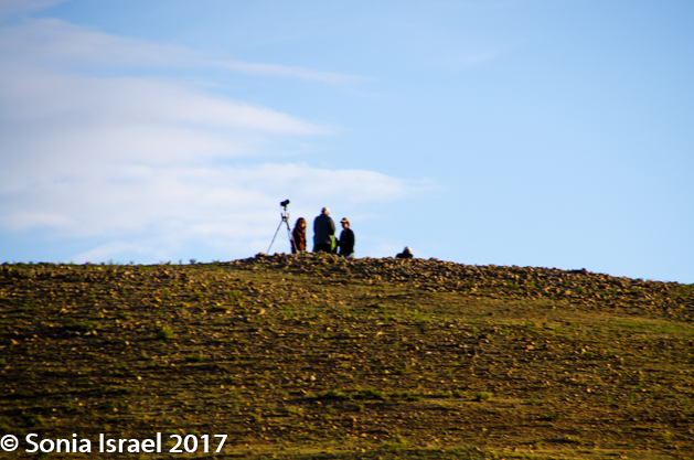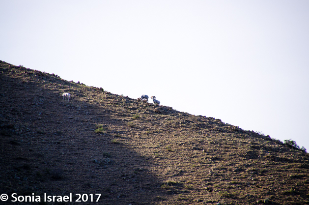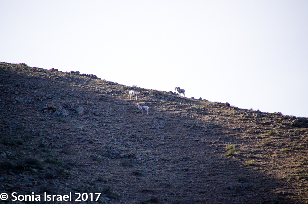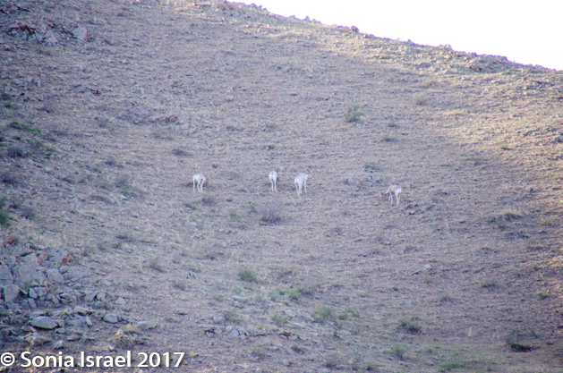 Ariunaa lifted her binoculars and there they were – five Argali sheep, all with large circular horns, climbing the mountain. Argali are mountain sheep, but don’t confuse them with the ones we see in the US. These are much bigger, standing 3-4 feet tall and 4-7 feet long. There are 300 Argali sheep in these mountains and this year they had 60 babies. They were hard to see even with my telephoto lens as they were so far up the mountain. But one of the drivers took my cell phone and photographed the sheep through the binoculars. And thus I have my Argali sheep picture.