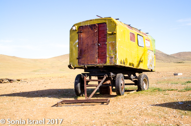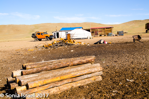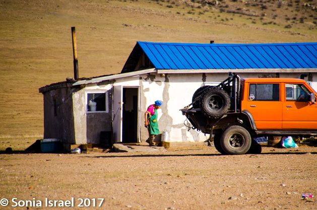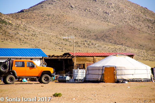 On the way back down we made an impromptu stop at a ger with an old Russian trailer next to it. It was a ger with an orange door. The truck was a yellow-green. There was a small white building with a blue roof. And a small wooden building with a red roof. And an orange jeep. Talk about color!