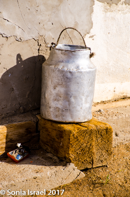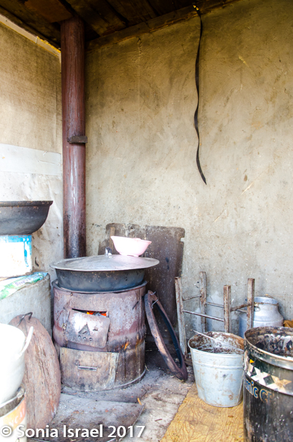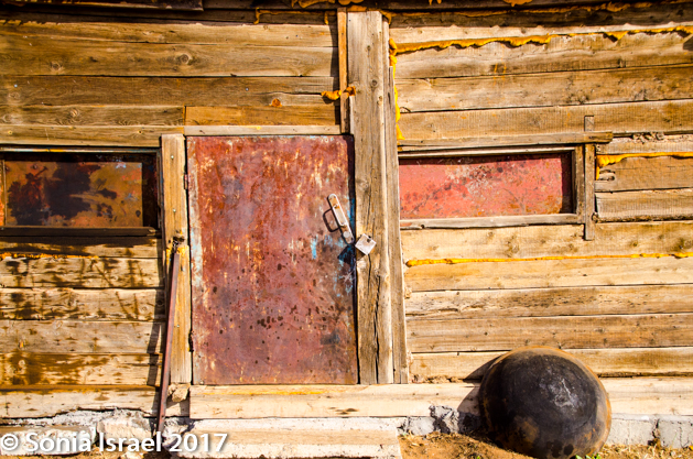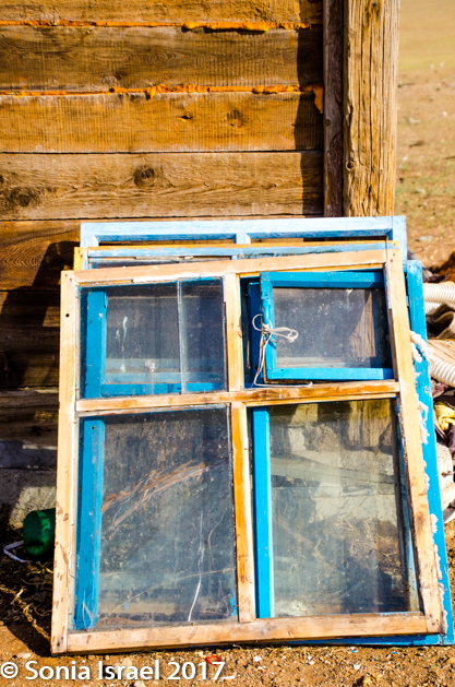 We were now brave enough to begin exploring her farm. The white building with the blue roof held a small kitchen, and by kitchen I mean a small stove with a pot on it. There was a large solar panel, leaning against the building. The door of the old wooden building was closed so we couldn’t look in. But the outside was made of different woods that had aged in different colors. Really this place was a photographer’s dream.