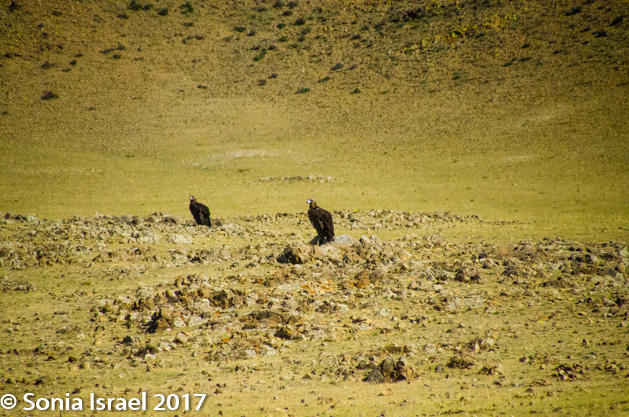 While we were shooting portraits, Michael, our fearless photography leader had wandered off in search of landscape shots (that is his thing). So some of the cars went to pick him up and the rest of us began heading back to the ger camp. And then we stopped and got out of the car as we were on a hill, overlooking a river (stream?) with a herd of yak at one end and a herd of sheep and goats at the other. On to the side of us were two large (huge!) vultures (I think that is what there were). And other large birds were soaring in the air.