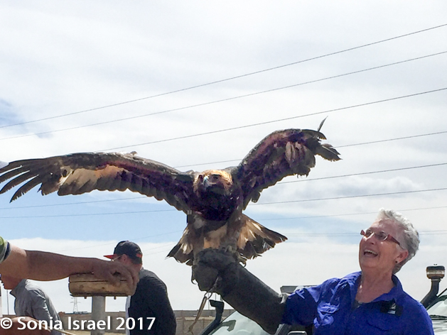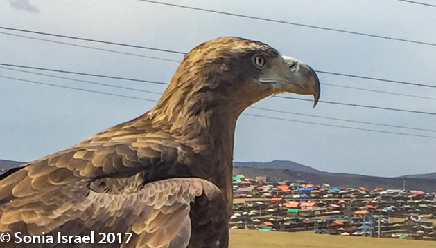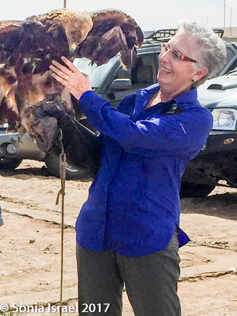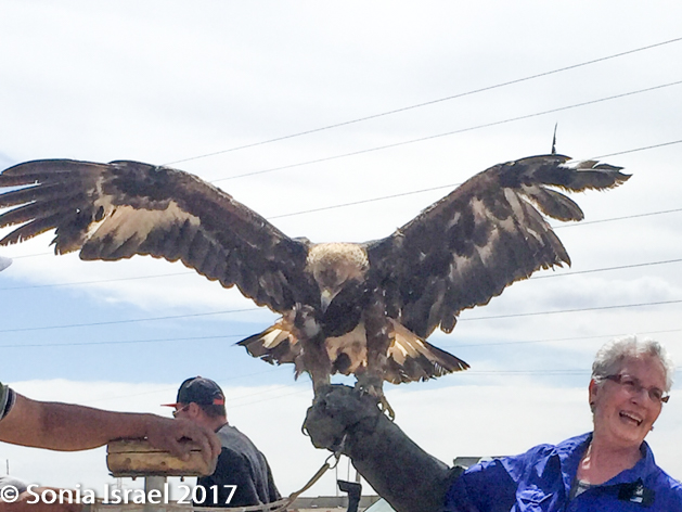 We were back on the road when Azaa suddenly called for the caravan to stop. There were eagles just waiting to be held. Yes, this was very touristy. Yes, we had to pay 4 Tughrik (the Mongolian currency, which was about 16 cents), to hold them. But hey, we were in Mongolia, land of the eagles after all. So we climbed out of our cars and took turns holding an eagle. There were two eagles, one a bald eagle (quite large) and one a golden eagle, a bit smaller. I opted for the smaller one. The owner put a glove on me and the eagle jumped on my arm. I couldn’t help but smile in wonder – wonder that I had the nerve to hold an eagle, and wonder that I was actually holding an eagle. This is Mongolia.