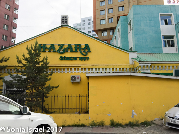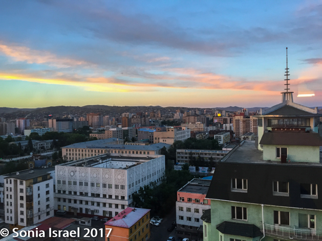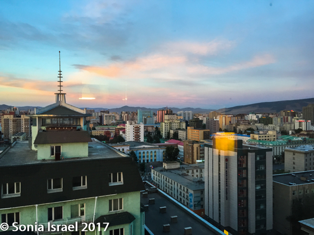 Before dinner, we headed up to the bar at the top of the Tushin Hotel where we had a free glass of wine or beer. We sat on the comfortable chairs and couches, drinking our wine and marveling at the 360 degree view of the tall, modern buildings surrounded by the mountains covered in gers and colored tin roofs.